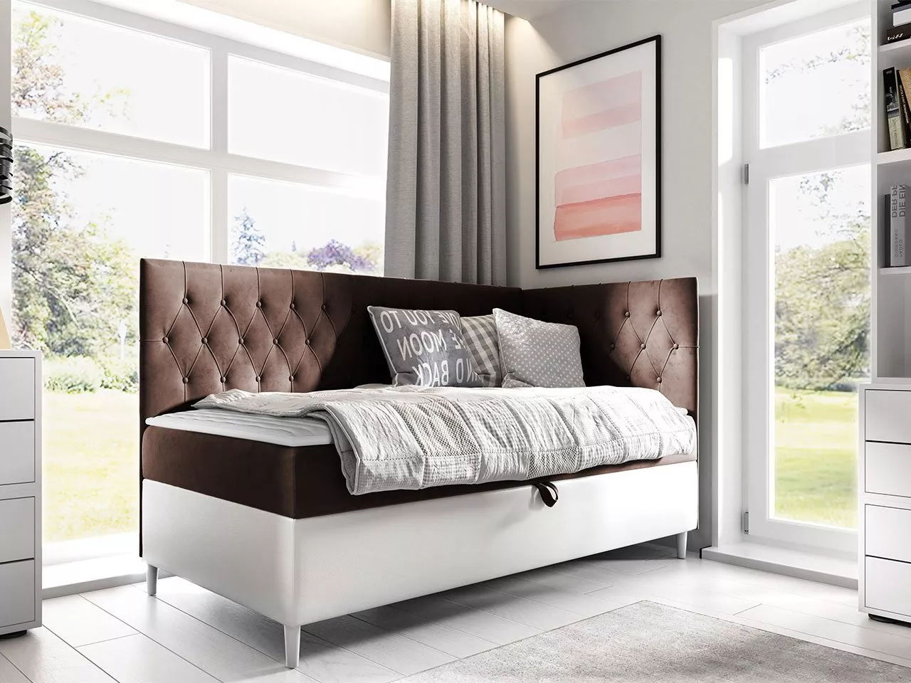 Boxspringová jednolůžková postel 90x200 PORFIRO 3 - bílá ekokůže / hnědá 1, pravé provedení + topper ZDARMA