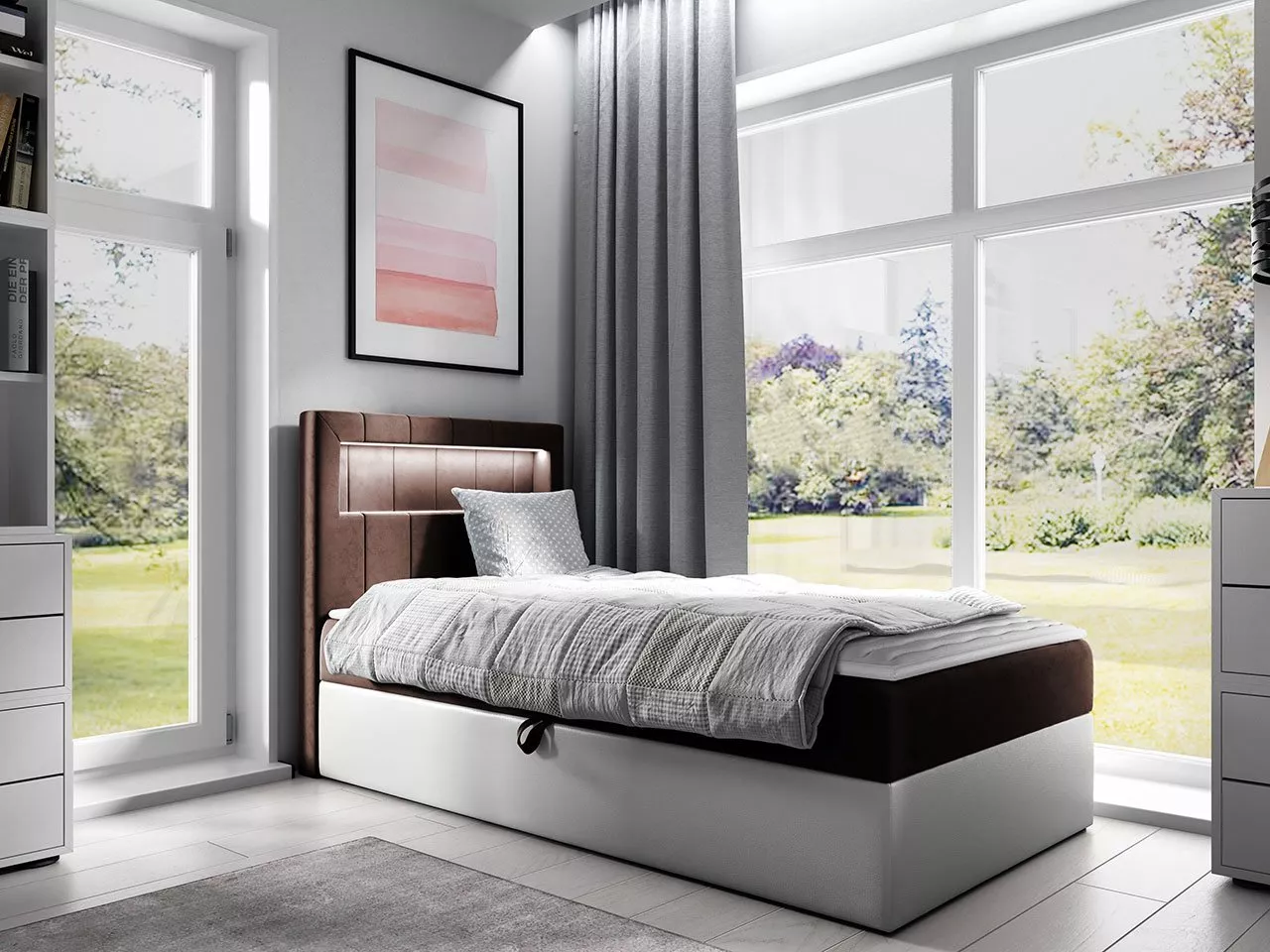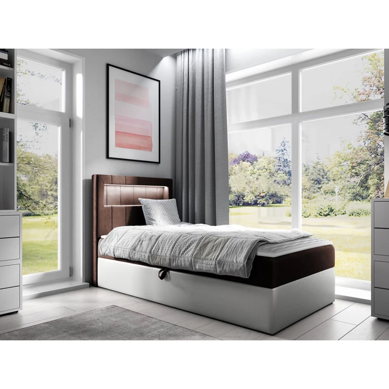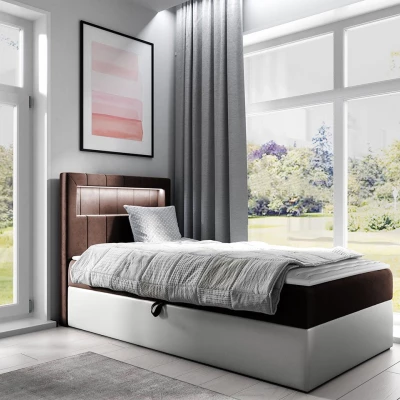 Kontinentální jednolůžková postel 90x200 RAMIRA 1 - bílá ekokůže / hnědá 1, pravé provedení + topper ZDARMA