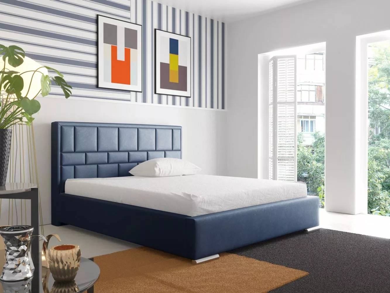 Čalouněná postel NERIA má čelo s ozdobným a zajímavým prošíváním na 3 cm molitanu, které se skvěle hodí pro moderní stavbu. Rošt tvoří kovový rám s pružnými lamelami, pod ním se pak skrývá úložný prostor.