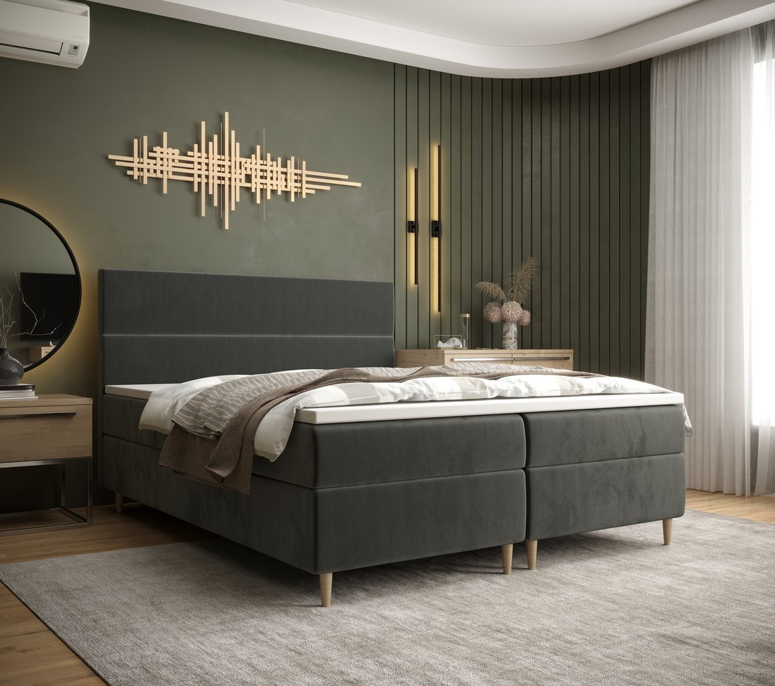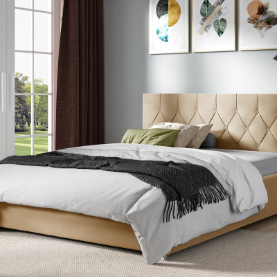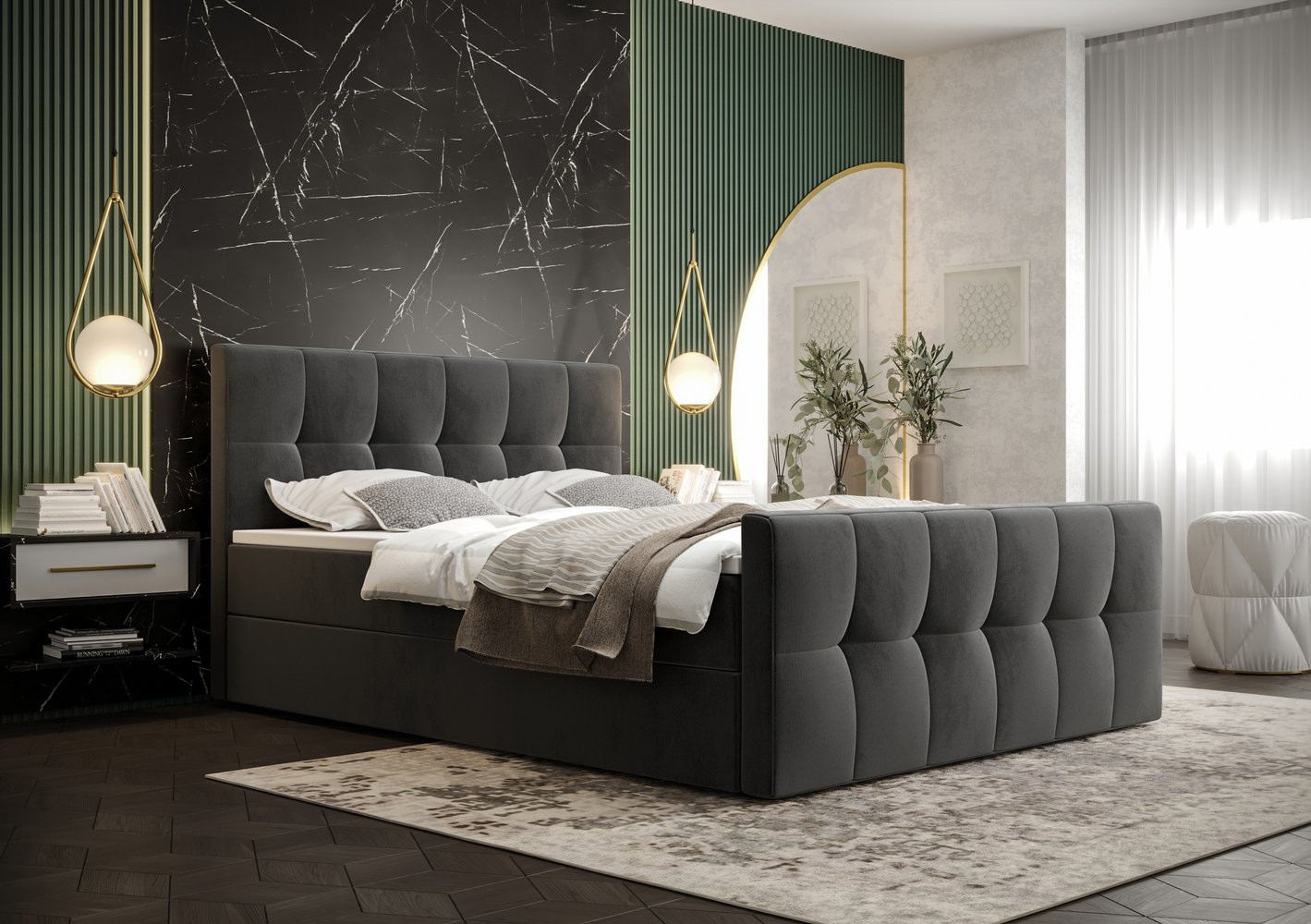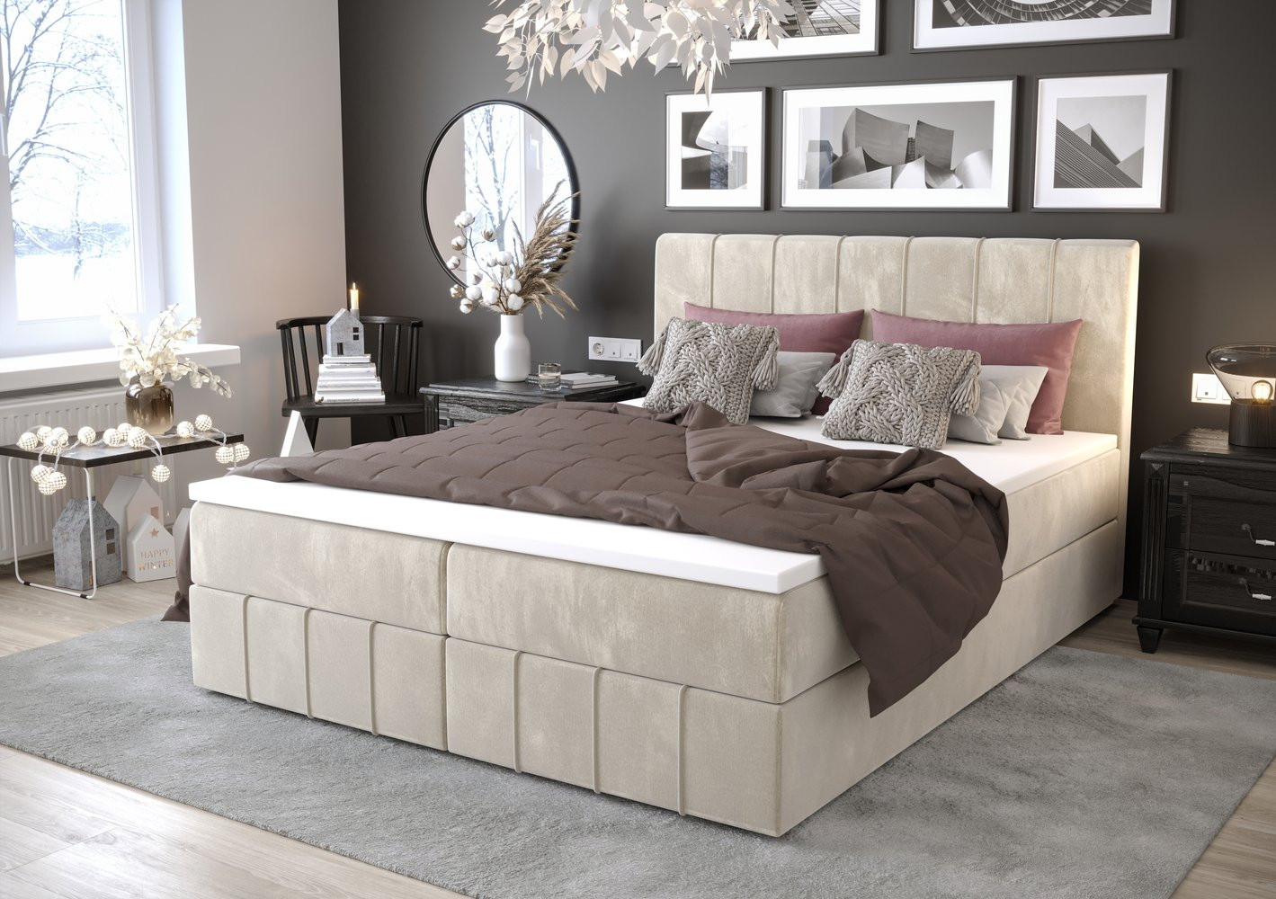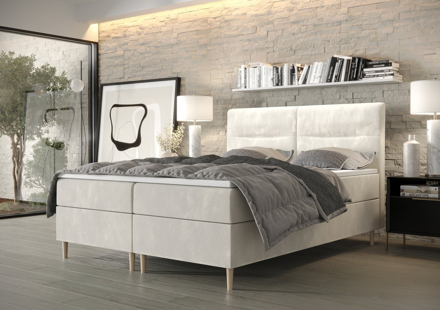 Manželská čalouněná postel s vysokým čelem pro pohodlné opření vyzařuje nadčasovou eleganci. Lůžko je vybaveno praktickým úložným prostorem.