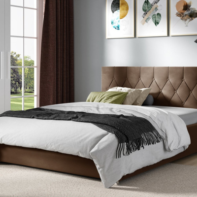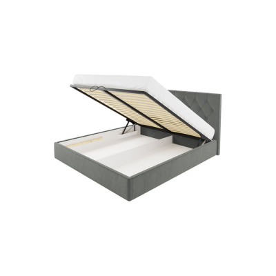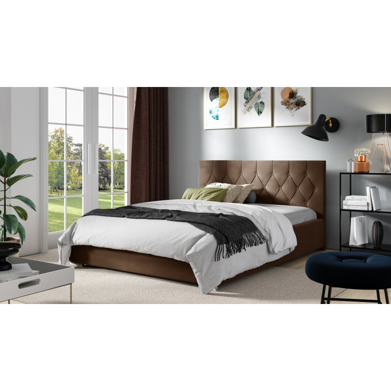 Manželská čalouněná postel s vysokým čelem pro pohodlné opření vyzařuje nadčasovou eleganci. Lůžko je vybaveno praktickým úložným prostorem.