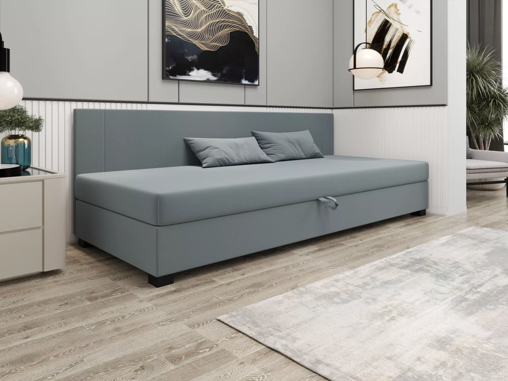 Čalouněná jednolůžková postel 90x195 ARIADNA BIZ 1 disponuje pohodlnou matrací, která zpříjemní každou chvíli odpočinku. Postel nabízí praktický úložný prostor pro uložení sezónního oblečení nebo ložního prádla. Příjemná potahová látka zvýší komfort používání.