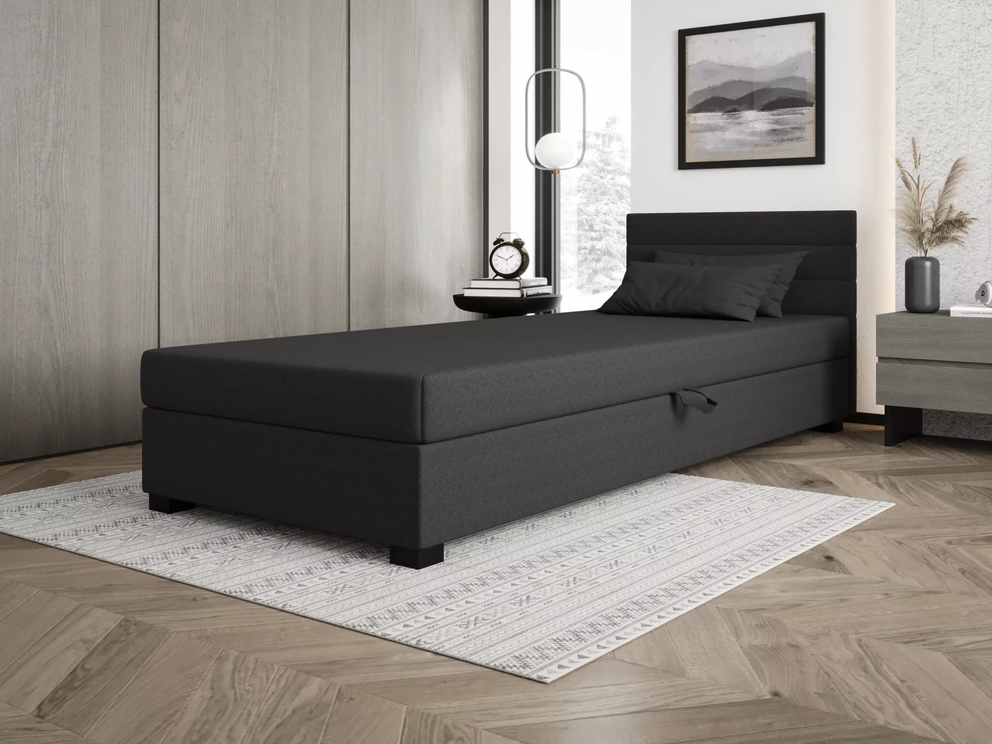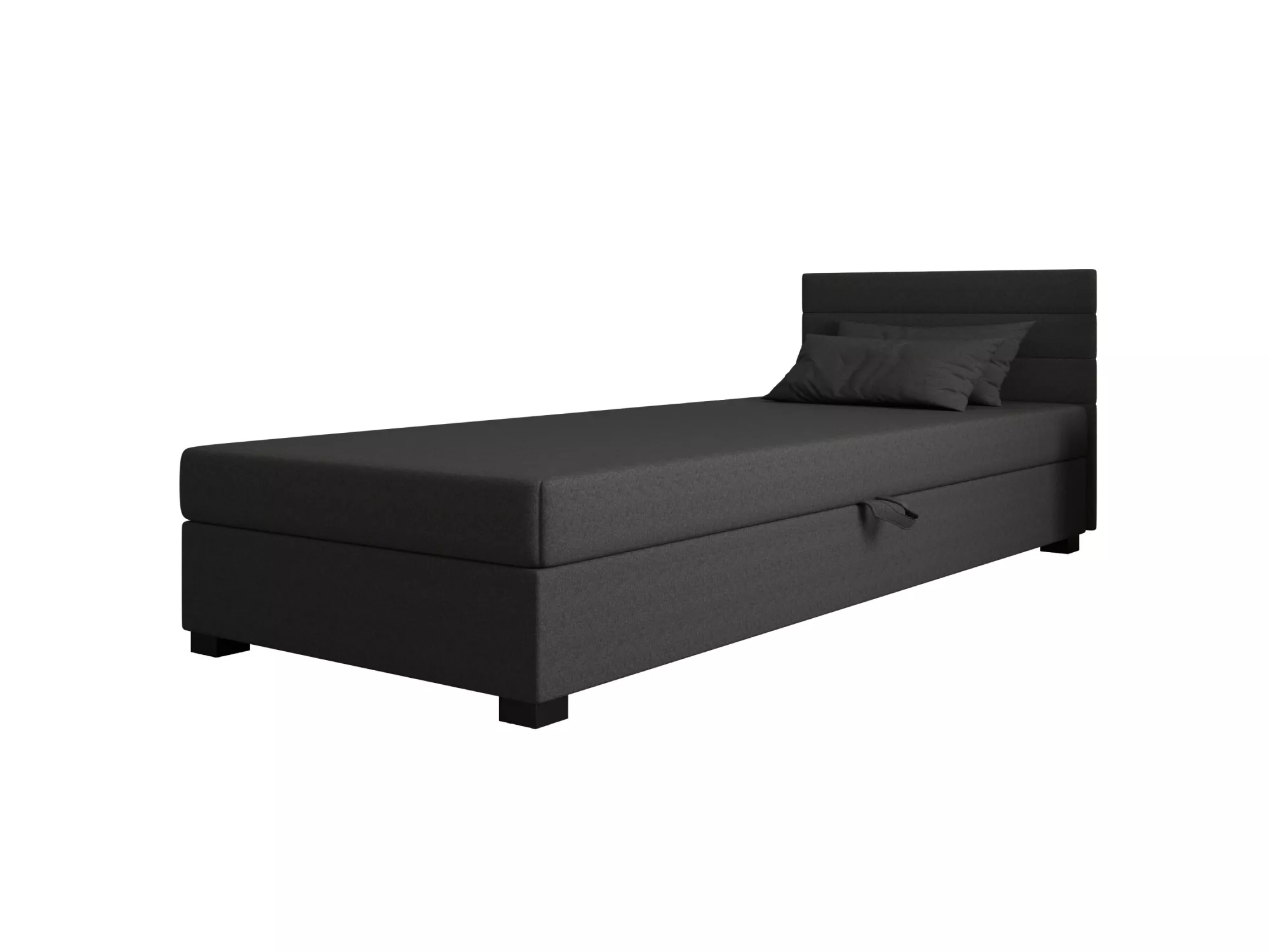 Čalouněná postel 90x195 KASANDRA 2 s úložným prostorem svým jednoduchým minimalistickým designem zapadne do každého studentského pokoje. Vysoké čalouněné čelo zabrání poškrábání a zašpinění zdi.
