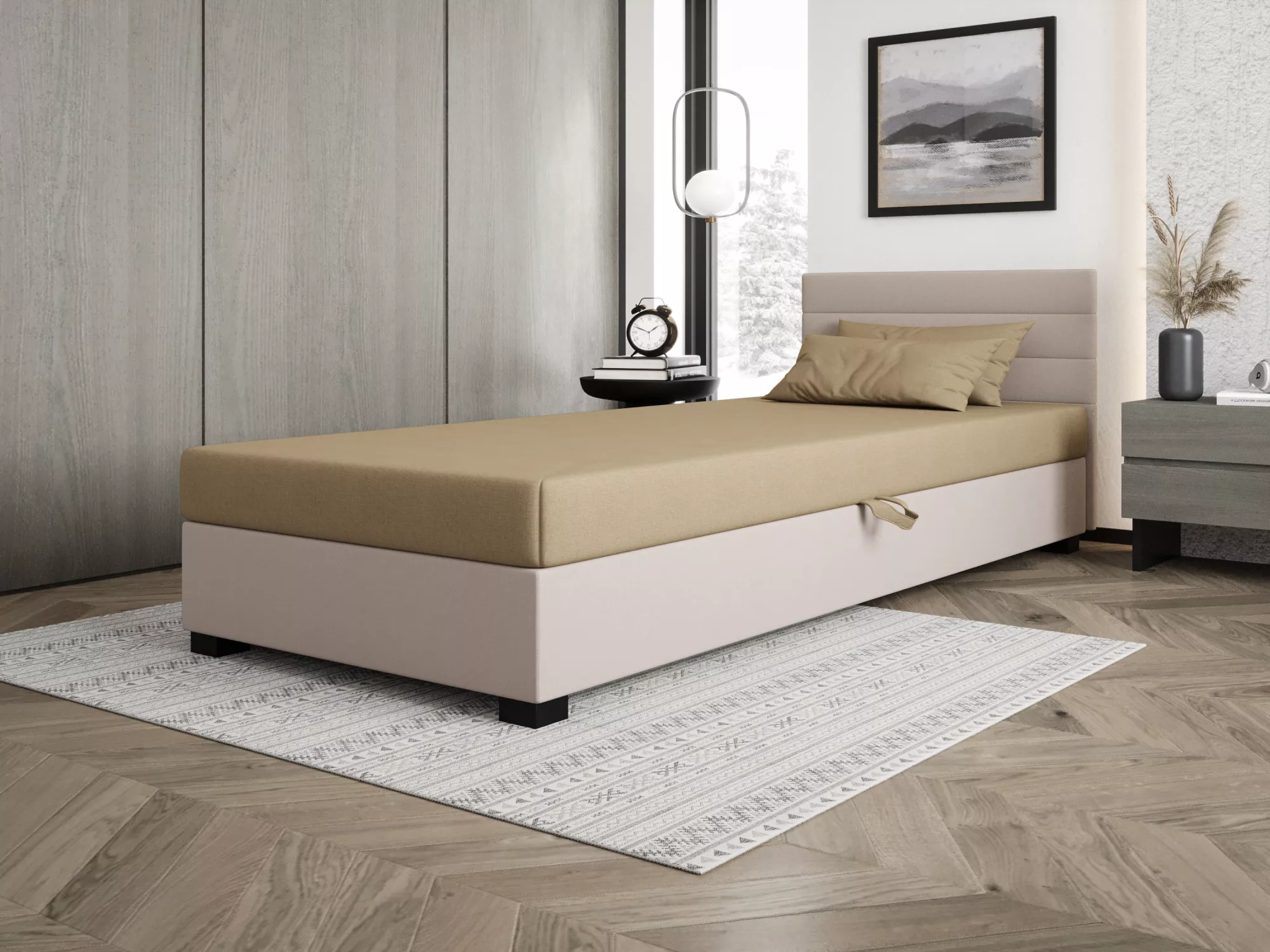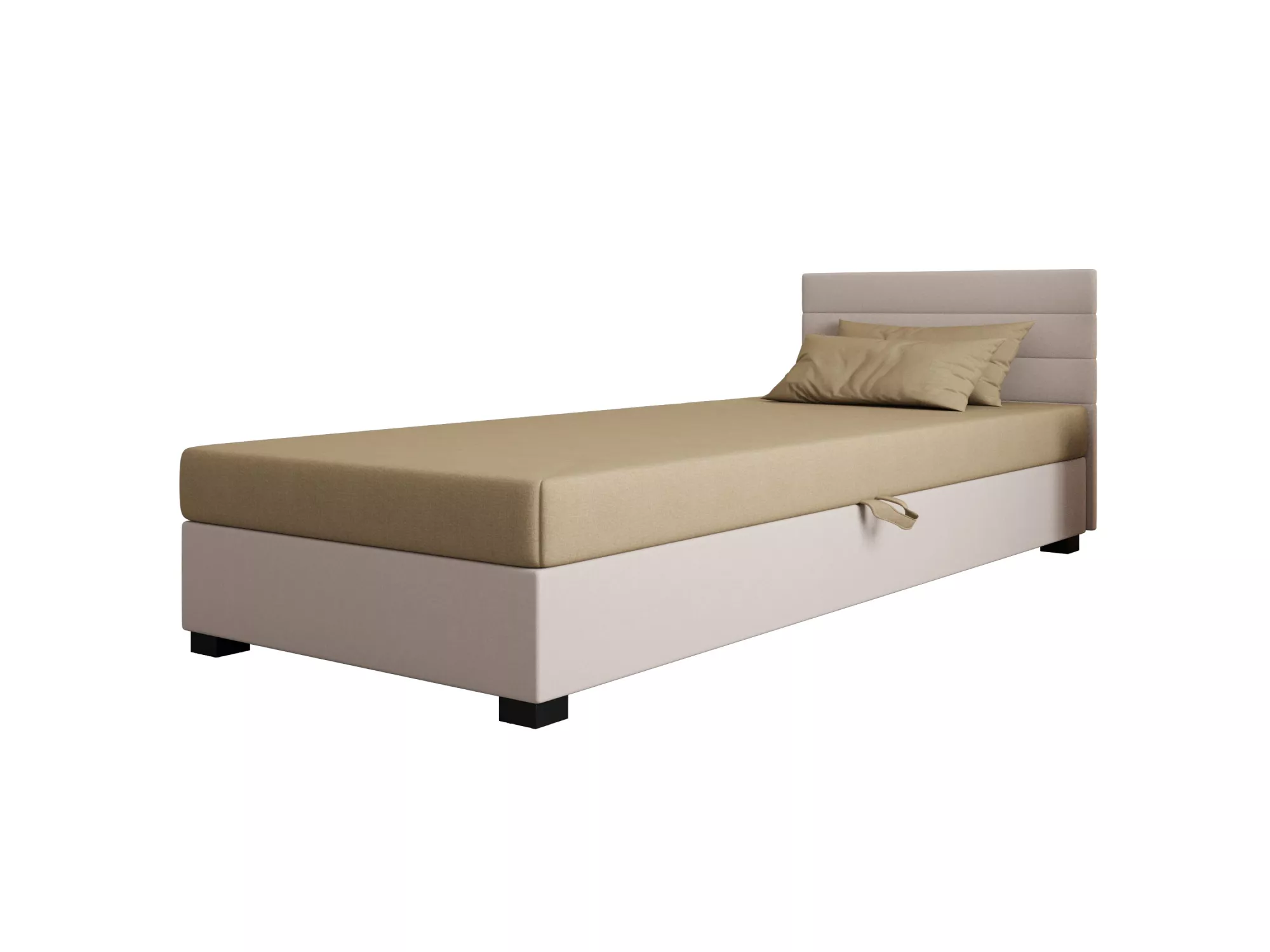 Čalouněná postel 120x195 KASANDRA 2 s úložným prostorem svým jednoduchým minimalistickým designem zapadne do každého studentského pokoje. Vysoké čalouněné čelo zabrání poškrábání a zašpinění zdi.