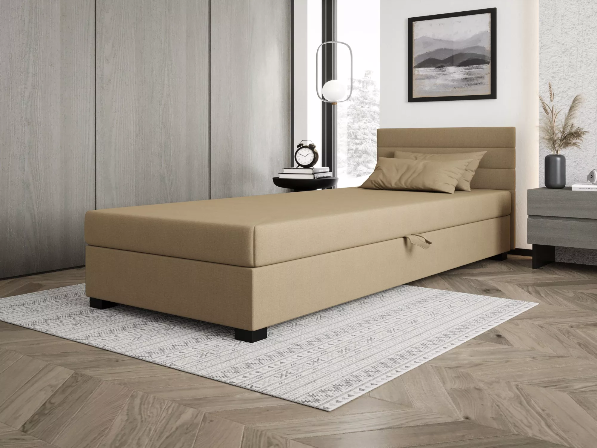 Čalouněná postel 90x195 KASANDRA 2 s úložným prostorem svým jednoduchým minimalistickým designem zapadne do každého studentského pokoje. Vysoké čalouněné čelo zabrání poškrábání a zašpinění zdi.