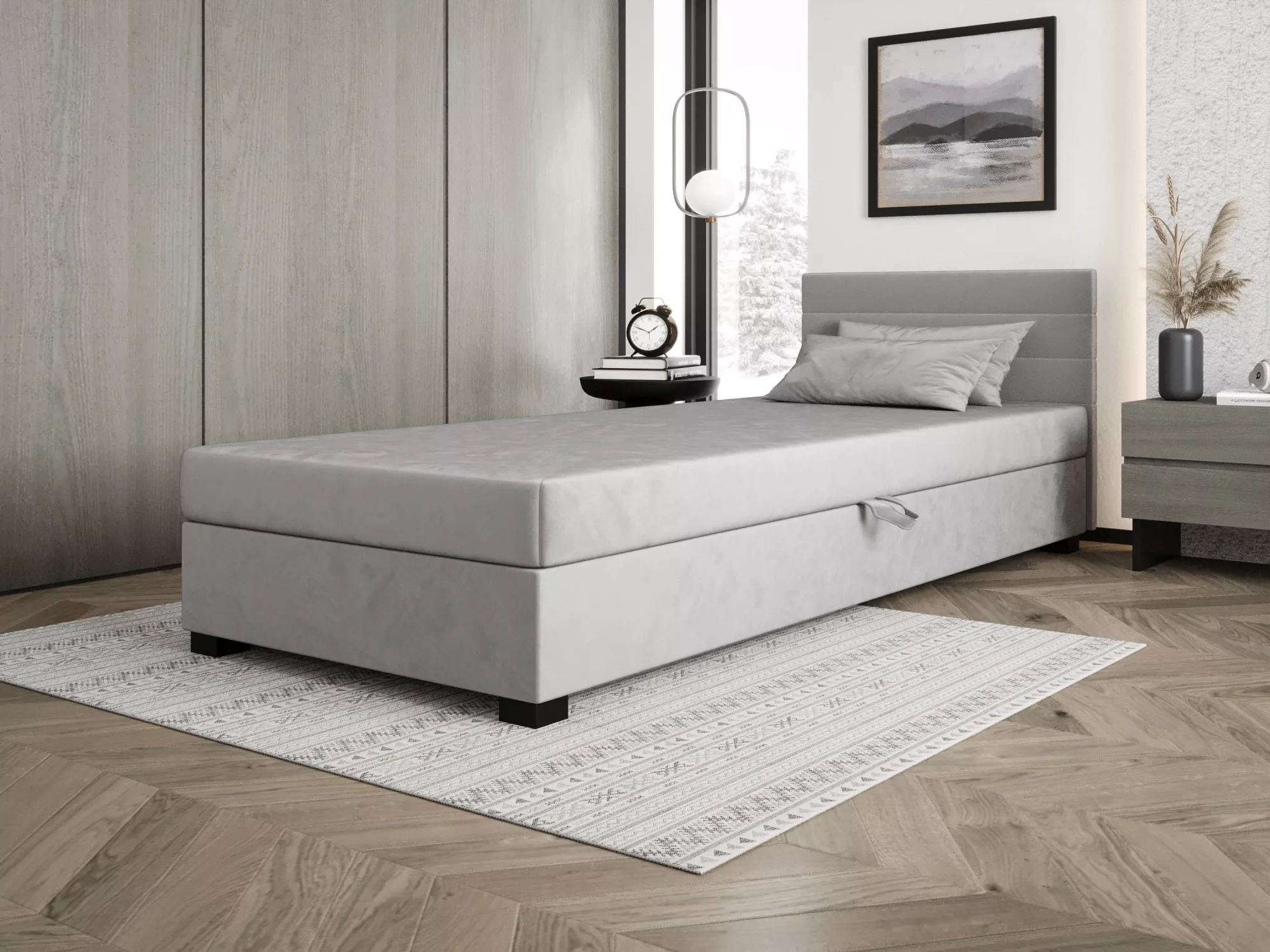 Čalouněná postel 90x195 KASANDRA 2 s úložným prostorem svým jednoduchým minimalistickým designem zapadne do každého studentského pokoje. Vysoké čalouněné čelo zabrání poškrábání a zašpinění zdi.