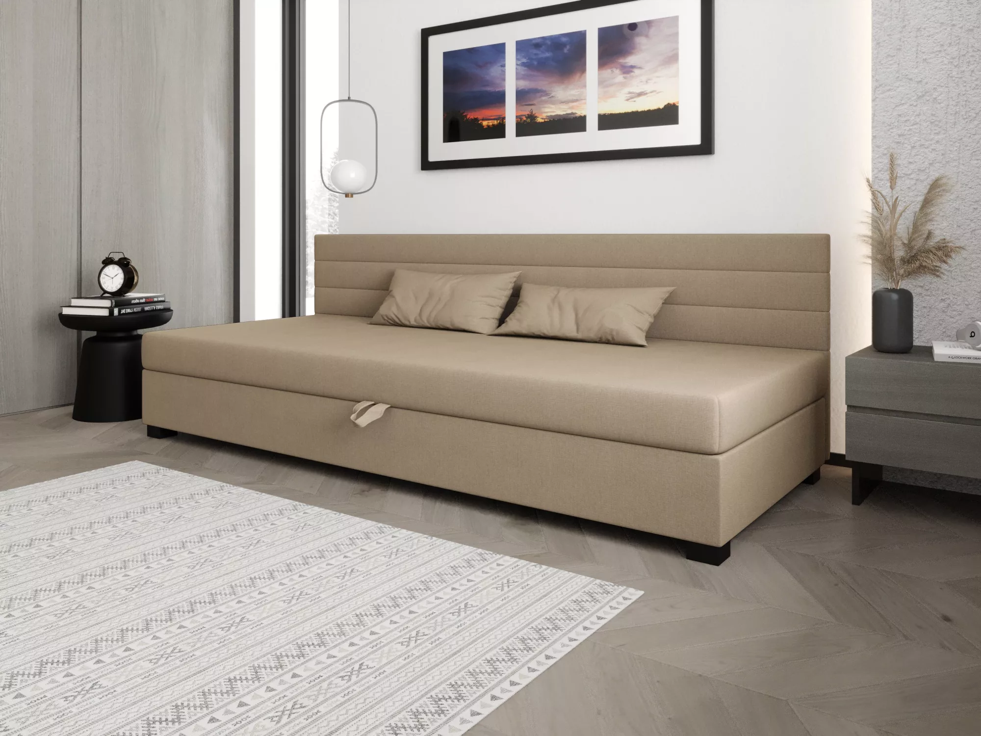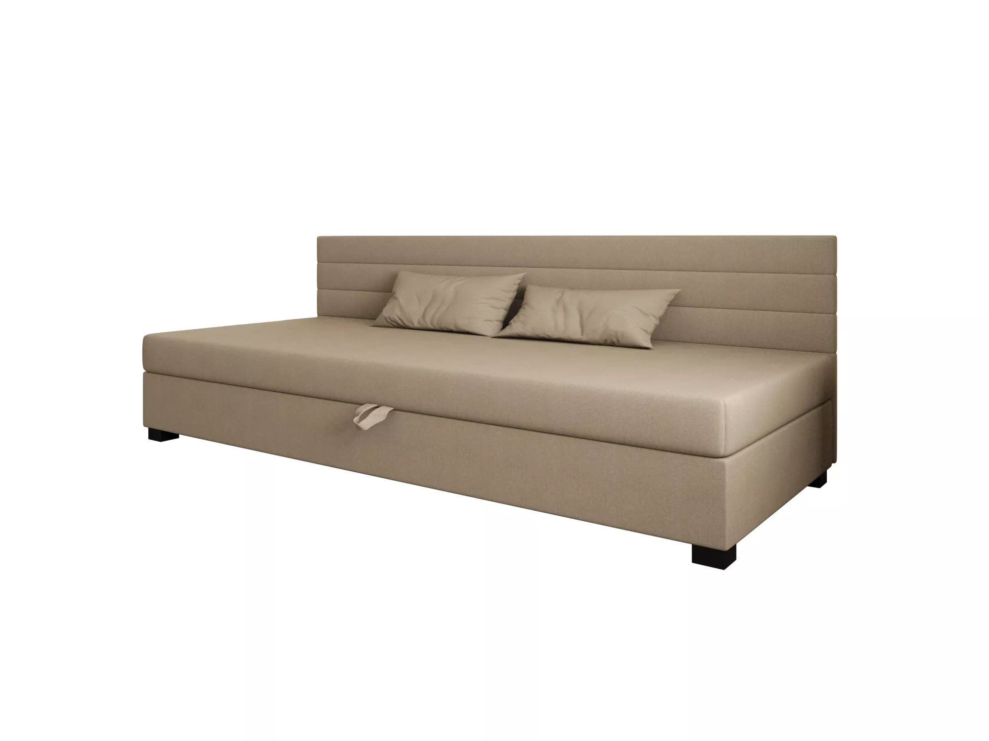 Čalouněná postel 110x195 KASANDRA BIZ 1 s úložným prostorem svým jednoduchým minimalistickým designem zapadne do každého studentského pokoje. Vysoké čalouněné čelo zabrání poškrábání a zašpinění zdi.