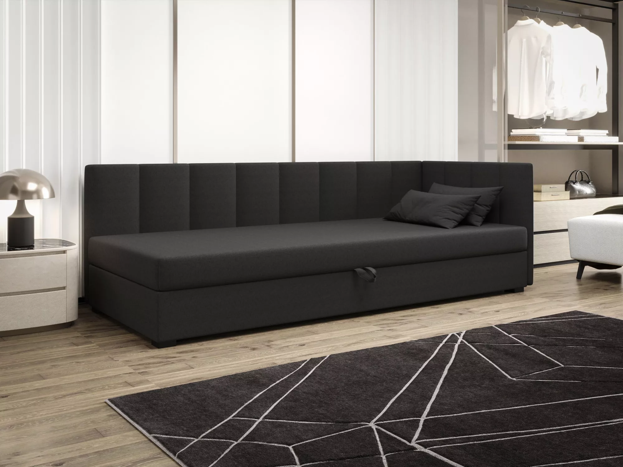 Součástí postele je zabudovaná matrace a úložný prostor.