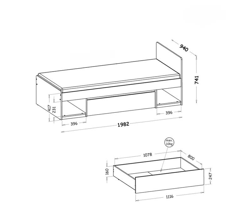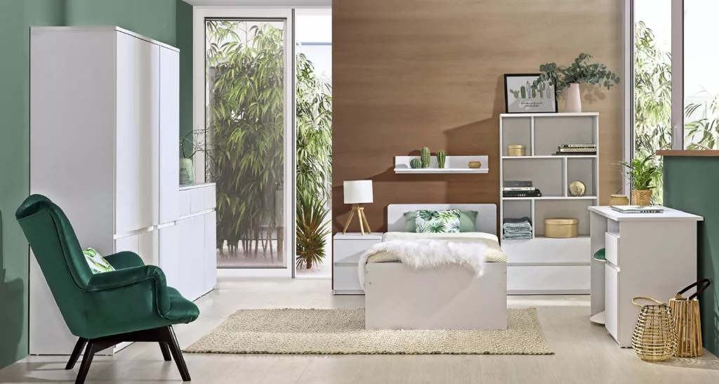 Jednolůžková postel se šuplíkem 90x195 CARYM vytvoří stylový a praktický prostor pro děti i studenty. Vysoké čelo poskytuje pohodlnou oporu při odpočinku i čtení. Šuplík a otevřené police nabídnou dostatek úložného místa na knihy, hračky i drobnosti.
