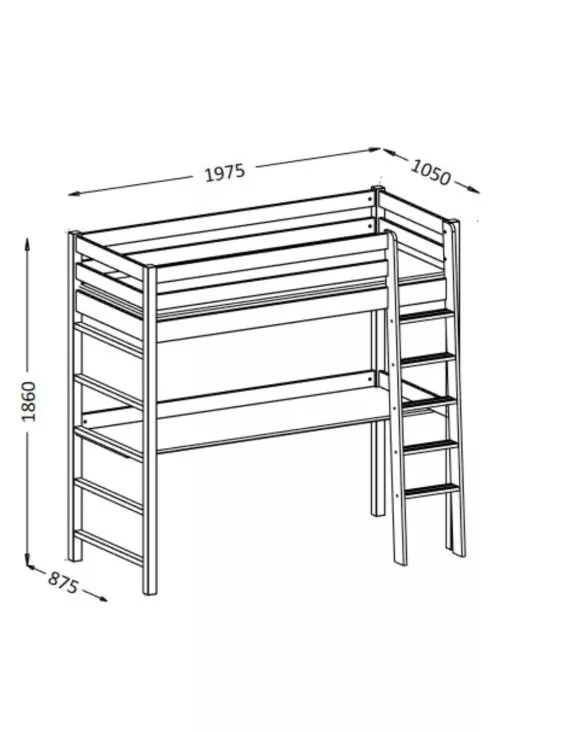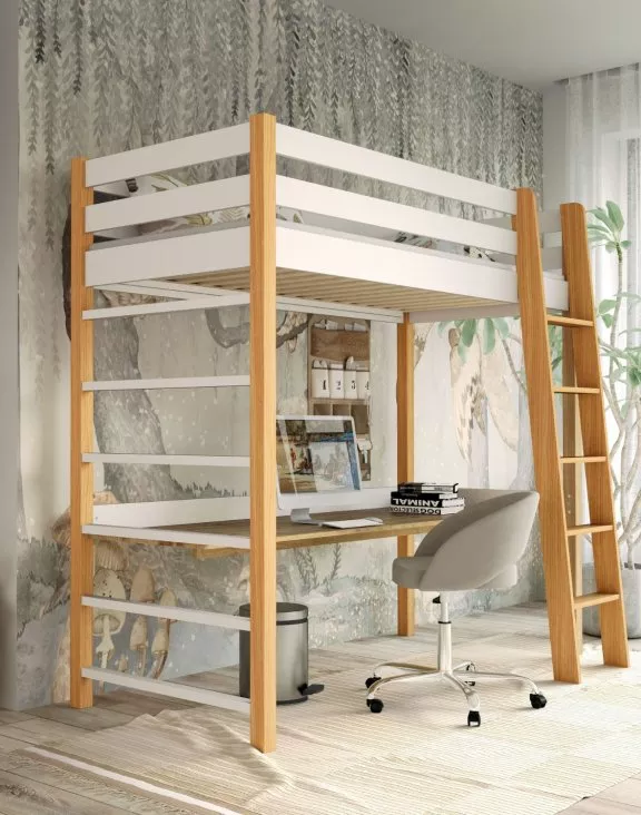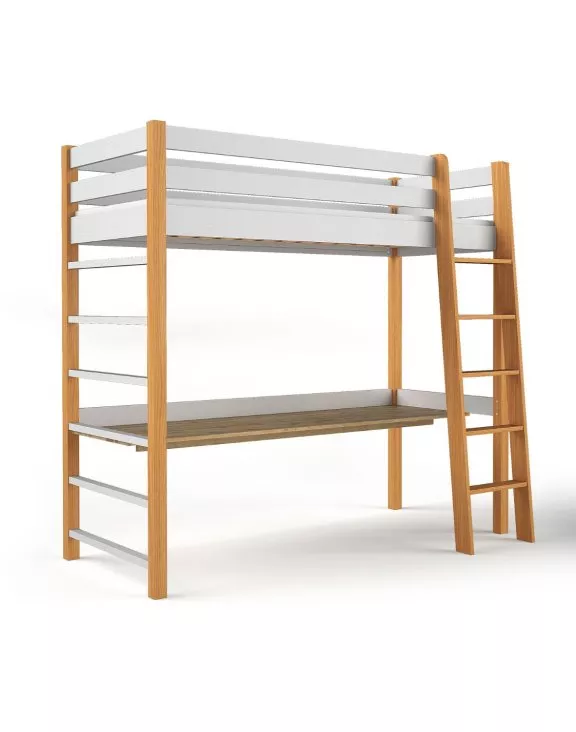 Dětská vyvýšená postel 80x190 GOLDBORO šetří místo a nabízí více funkcí v jednom. Kompaktní design spojuje pohodlné lůžko s praktickým psacím stolem přímo pod postelí. Konstrukce z borovicového dřeva zaručuje stabilitu, odolnost i bezpečnost při každodenním používání. Žebřík lze namontovat na pravou nebo levou stranu, takže se postel snadno přizpůsobí každému prostoru.