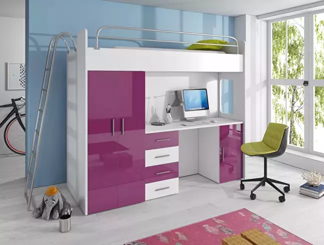 Postel s psacím stolem do dětského pokoje RENI 4 - 80x200, bílá / fialová