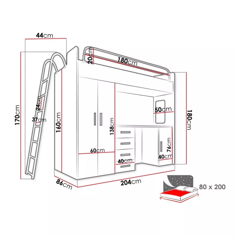 Dětská postel RENI kombinuje moderní design a dokonalou praktičnost. Vhodná je také do malých prostorů. Součástí postele je skříň, psací stůl se šuplíky a žebřík.