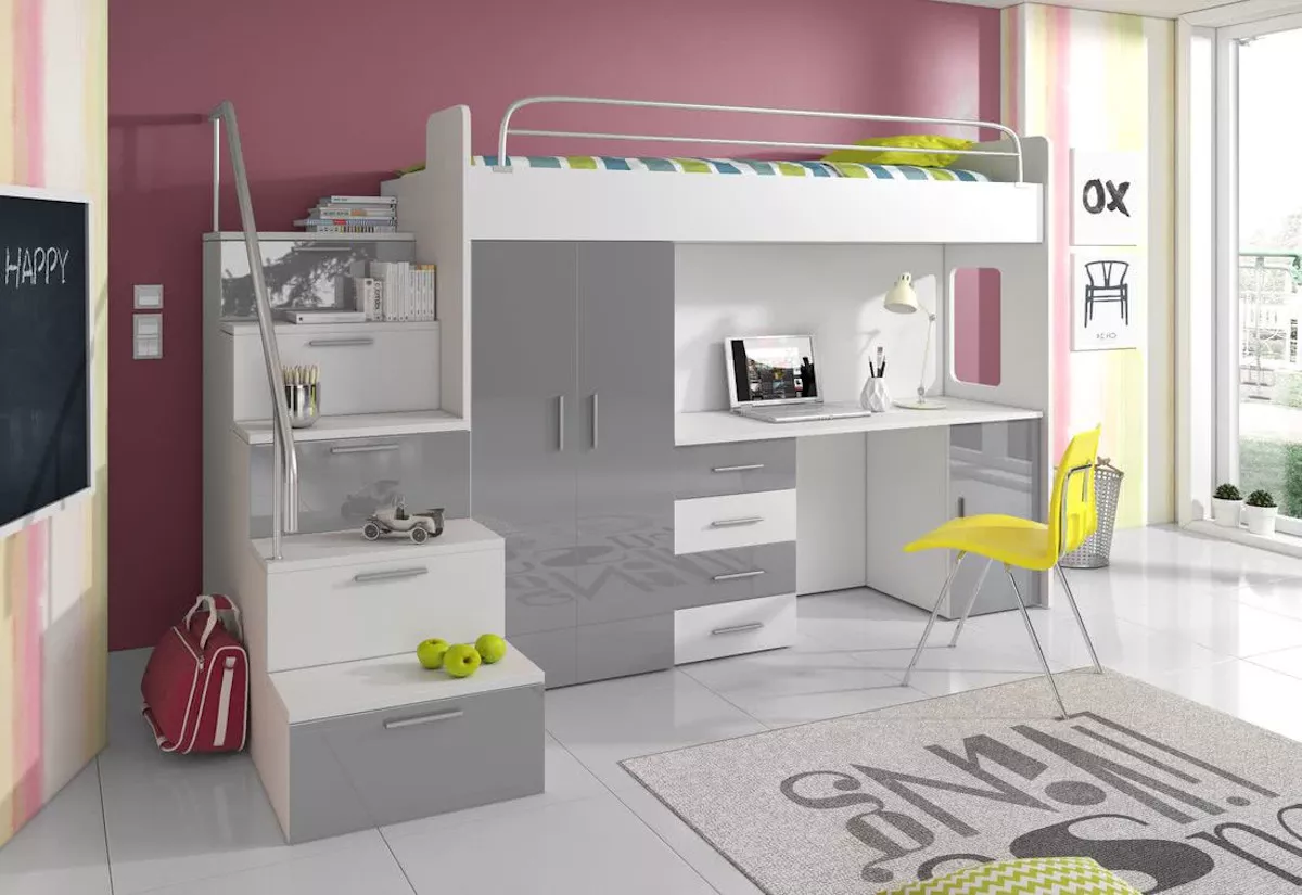 Dětská patrová postel s psacím stolem RENI 4 - 80x200, bílá / šedá