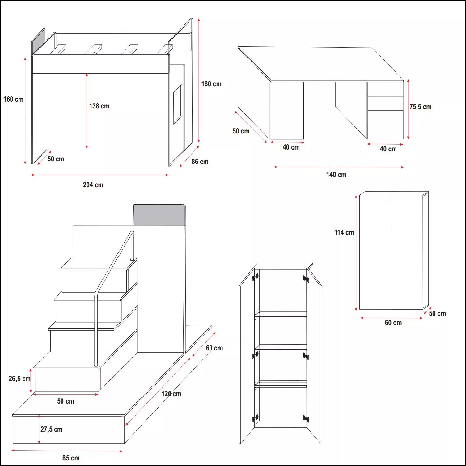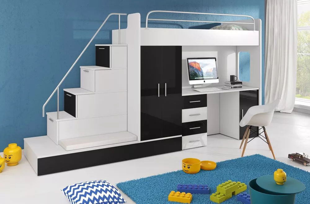 Dětská postel s psacím stolem RENI 5 - 80x200, bílá / černá
