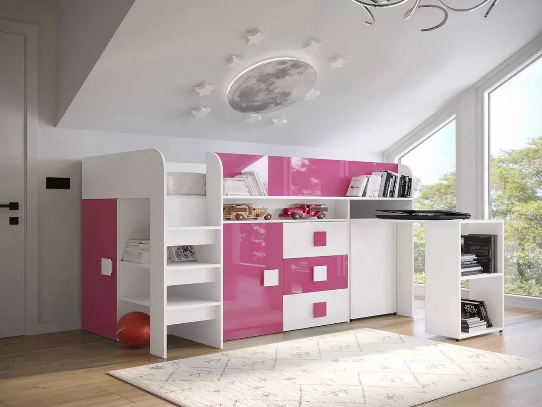 Zvýšená multifunkční dětská postel 90x200 LANKA 1 - bílá / lesklá bílá / lesklá růžová