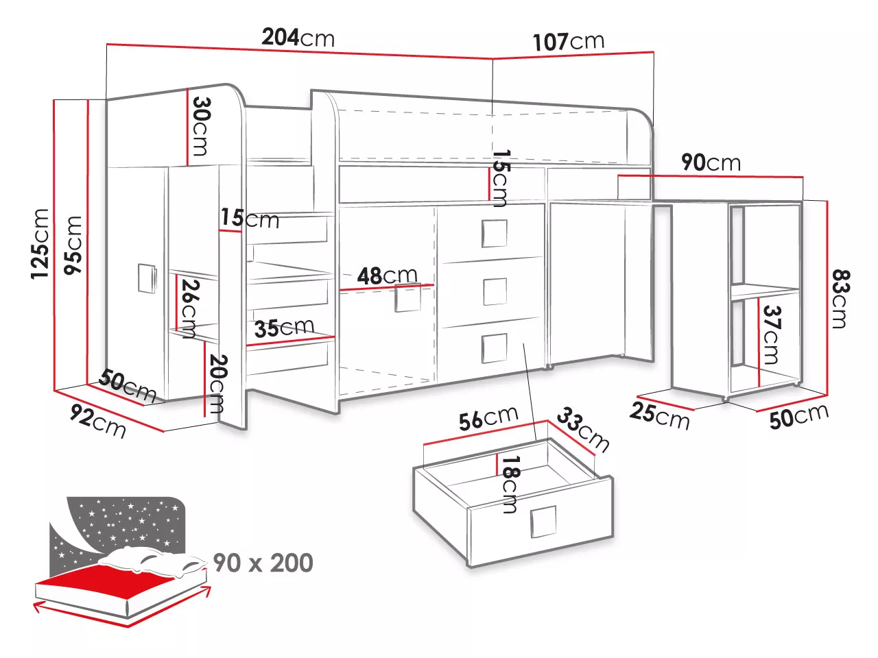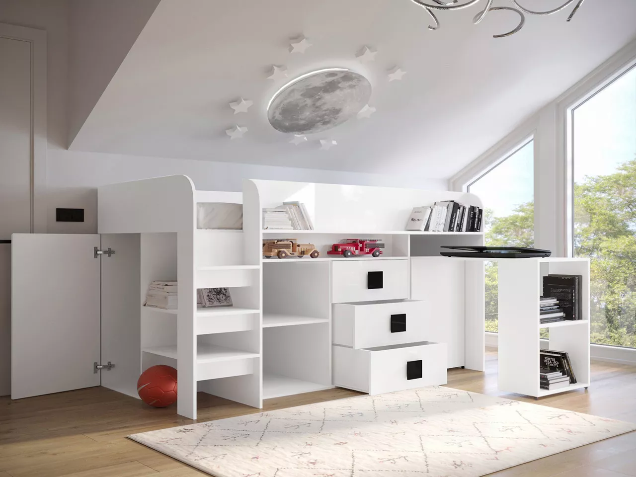 Postel LANKA je multifunkční řešení i do malého dětského pokoje. Kromě pohodlného lůžka na spaní o spací ploše 90x200 cm je postel vybavena prostorným psacím stolem a spoustou skříněk, polic a zásuvek, které perfektně uspořádají oblečení a školní pomůcky vašeho dítěte.