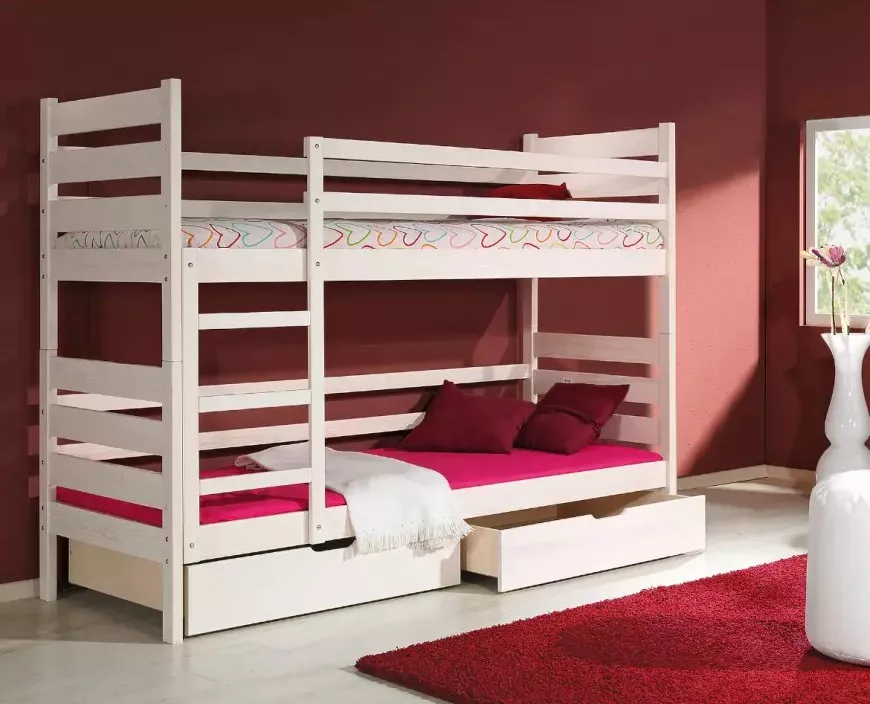 Dvoupatrová postel 80x190 MARIONE nabízí 2 praktické šuplíky pro úschovu lůžkovin nebo hraček. Postel bude ideální volbou do každého menšího dětského pokoje, kde potřebujete ušetřit místo. Praktické zábrany zvyšují bezpečnost postele.