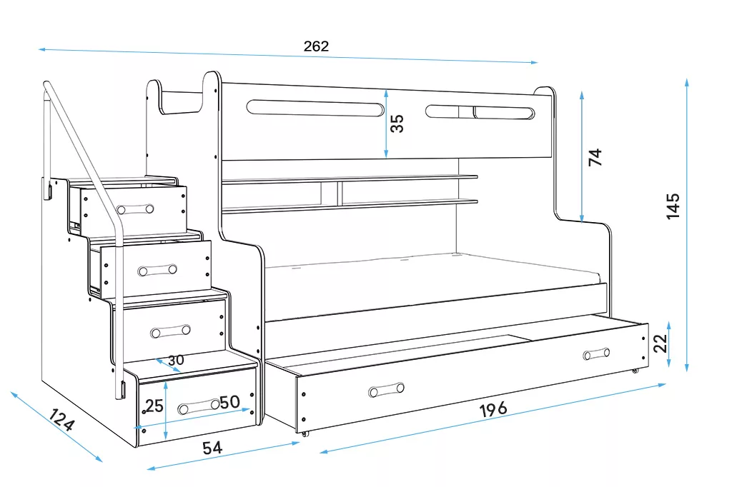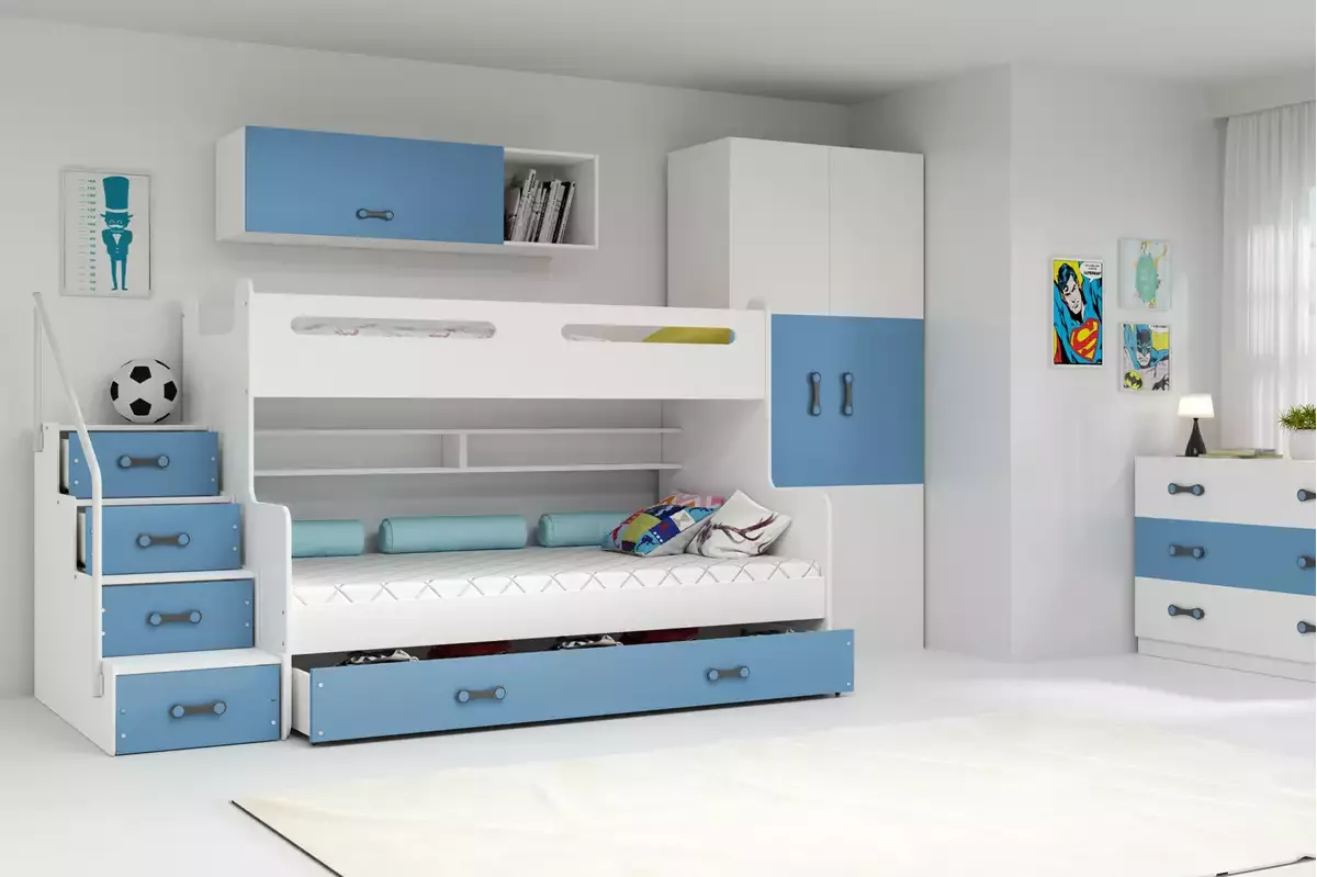 Dětská multifunkční patrová postel s úložným prostorem nabízí jednoduché řešení při nedostatku místa na spaní, hraní i učení. Pořízením této postele získáte celou řadu dalších dílu nábytku jako jsou schůdky s úložným prostorem, které lze k posteli přiložit na levou či pravou stranu tak, jak potřebujete a praktickými poličkami na oblíbené knížky.