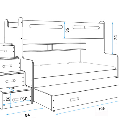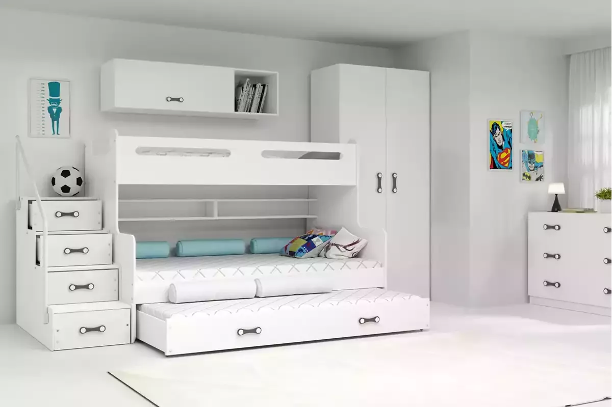 Dětská multifunkční patrová postel s přistýlkou nabízí jednoduché řešení při nedostatku místa na spaní, hraní i učení. Pořízením této postele získáte celou řadu dalších dílu nábytku jako jsou schůdky s úložným prostorem, které lze k posteli přiložit na levou či pravou stranu tak, jak potřebujete a praktickými poličkami na oblíbené knížky.