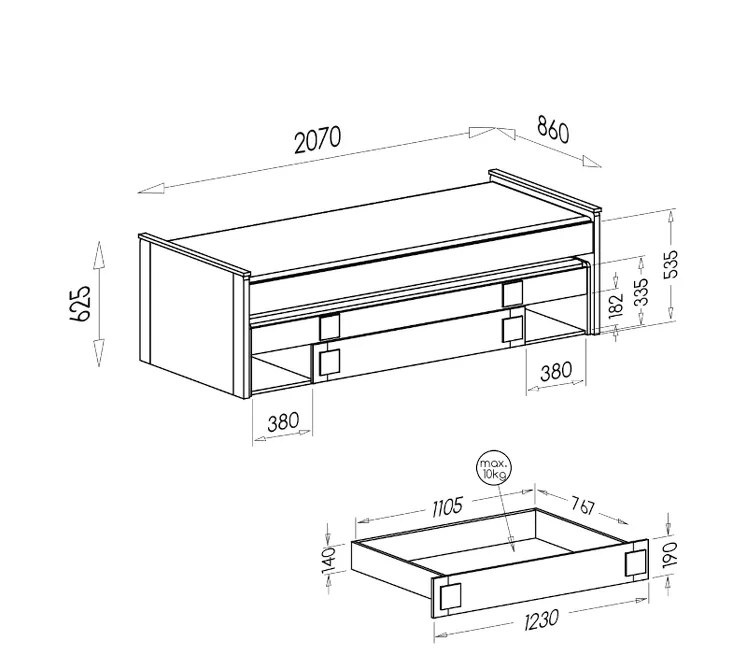 Jednolůžková postel s přistýlkou 80x200 BURGAW nabídne ideální řešení pro využití menšího prostoru v pokoji. Šuplík poslouží jako úložný prostor na hračky, oblečení nebo školní potřeby. Design postele je ideální pro dětské i studentské pokoje.