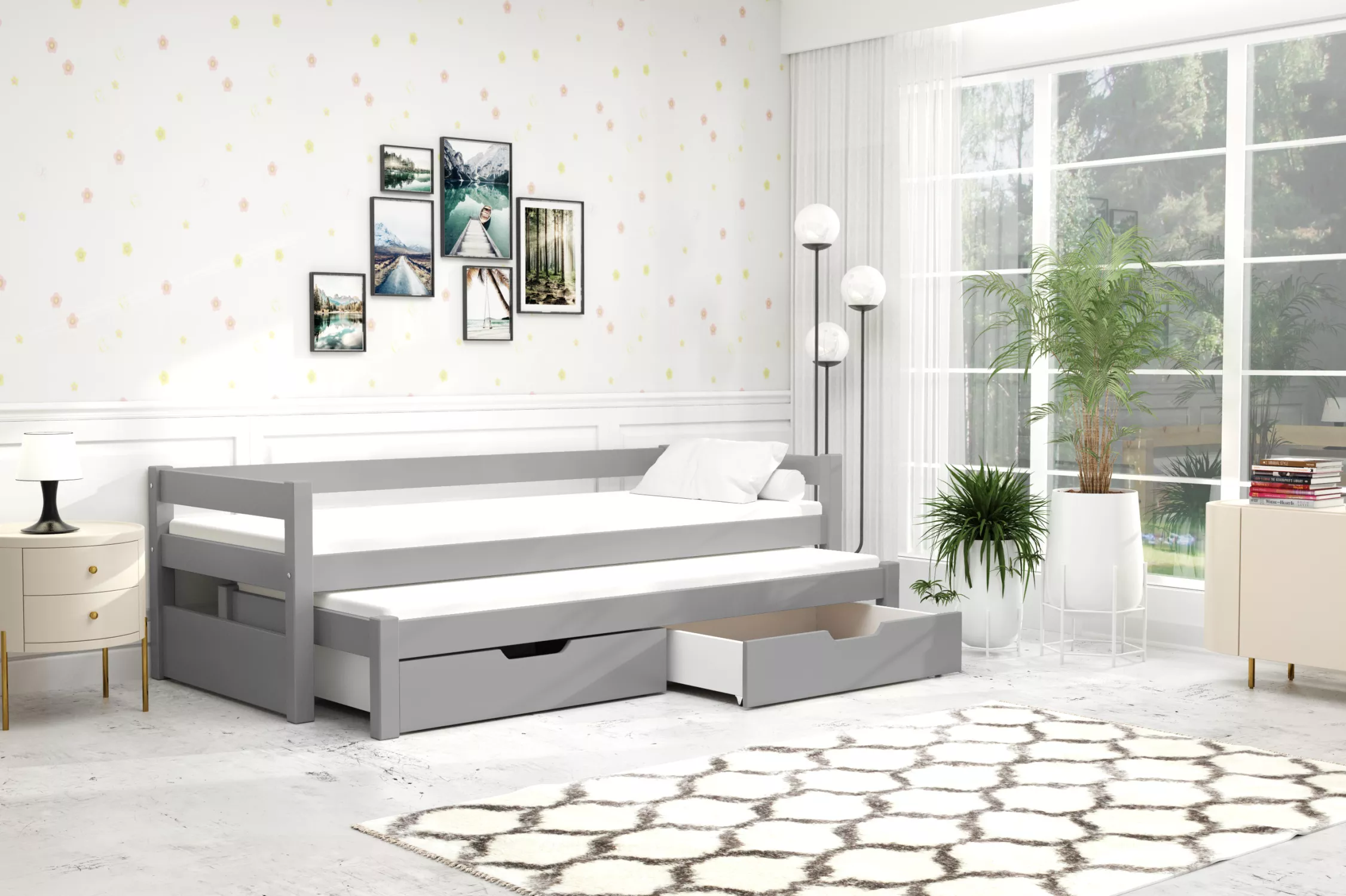 U postele je na první pohled zřejmé kvalitní zpracování, a to díky začištěnému hladkému povrchu. Postel je vybavena přistýlkou, která může sloužit jako plnohodnotné lůžko pro dalšího sourozence, nebo pouze pro občasné návštěvy. Výsuvné šuplíky pod postelí budou skvělým místem na úschovu peřin a polštářů.