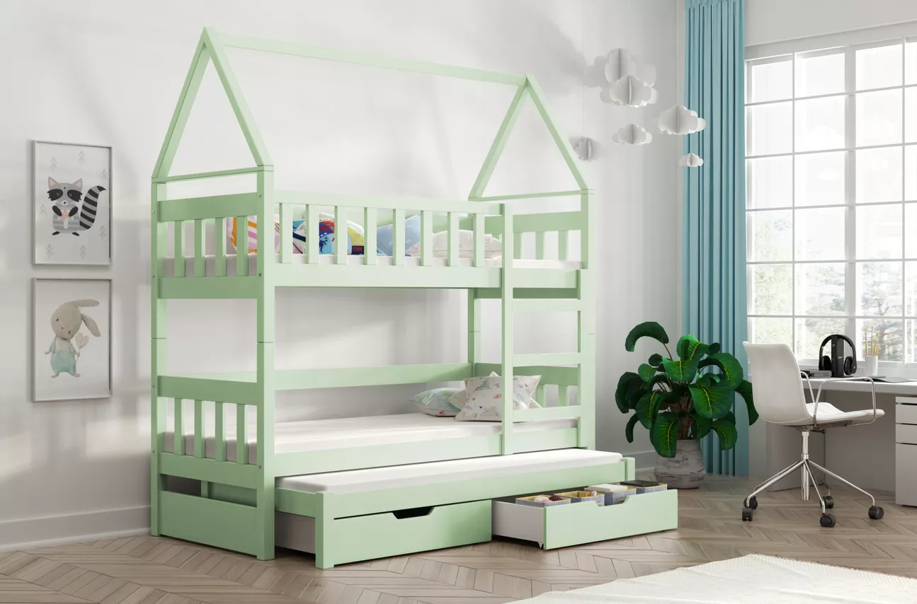 Domečková postel 75x180 DAFNE se hodí do všech dětských pokojů. Postel nabízí 3 ložné plochy a 2 zásuvky.