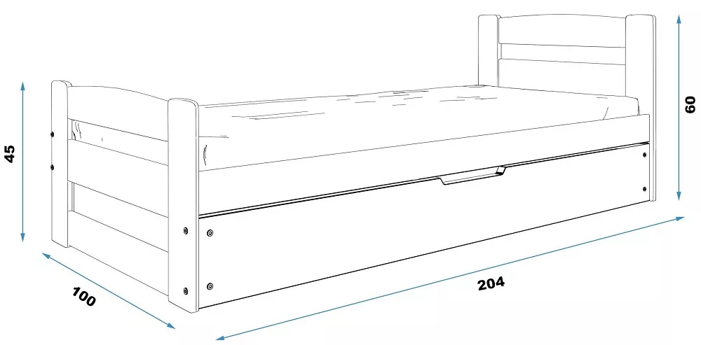 Dětská postel je vybavená úložným prostorem, který slouží například k ukládání peřin, hraček či oblečení. Základem konstrukce postele je masivní rám z borovicového dřeva, který posteli dodává bezpečnou stabilitu.