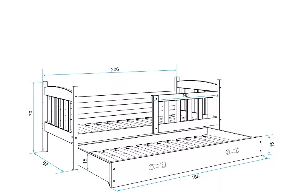 Dětská postel je vybavená úložným prostorem, který slouží například k ukládání peřin, hraček či oblečení. Základem konstrukce postele je masivní rám z borovicového dřeva, který posteli dodává bezpečnou stabilitu. Postel se vyrábí jako oboustranná a podle potřeby ji lze při montáži složit jako pravostrannou nebo levostrannou.