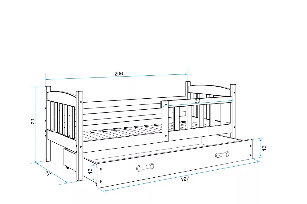 Dětská postel je vybavená úložným prostorem, který slouží například k ukládání peřin, hraček či oblečení. Základem konstrukce postele je masivní rám z borovicového dřeva, který posteli dodává bezpečnou stabilitu. Postel se vyrábí jako oboustranná a podle potřeby ji lze při montáži složit jako pravostrannou nebo levostrannou.