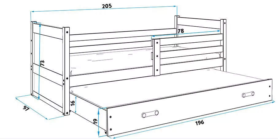 Dětská postel nabízí jednoduché řešení při nedostatku místa. Základem konstrukce postele je masivní rám z borovicového dřeva, který posteli dodává bezpečnou stabilitu. Postel se vyrábí jako oboustranná a podle potřeby ji lze při montáži složit jako pravostrannou nebo levostrannou.