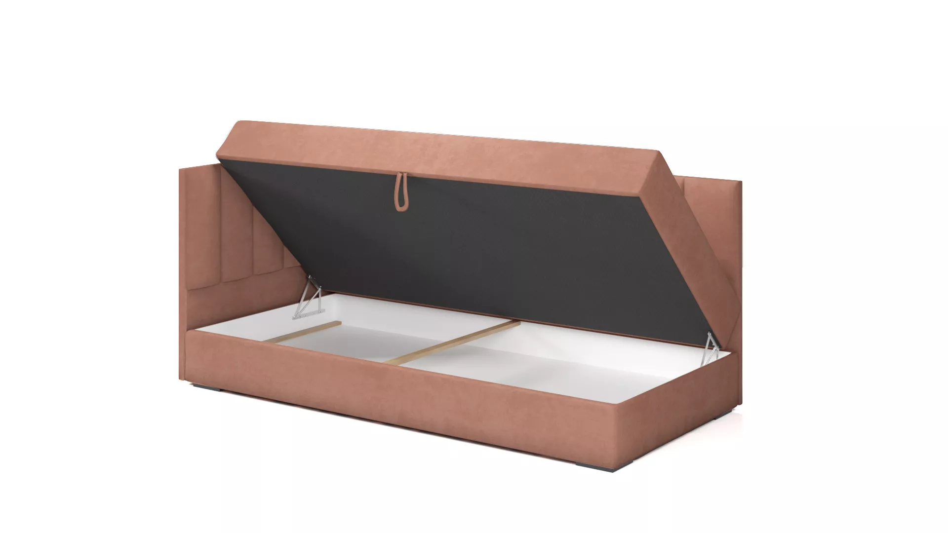 Válenda s úložným prostorem 90x200 ALAMO 3 má čalouněné čelo, které chrání stěnu před znečištěním. Ve velkém úložném prostoru schováte lůžkoviny nebo sezónní oblečení. Válenda je potažená látkou příjemnou na dotek, což zvyšuje komfort každodenního používání.