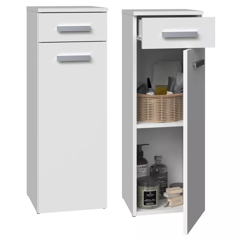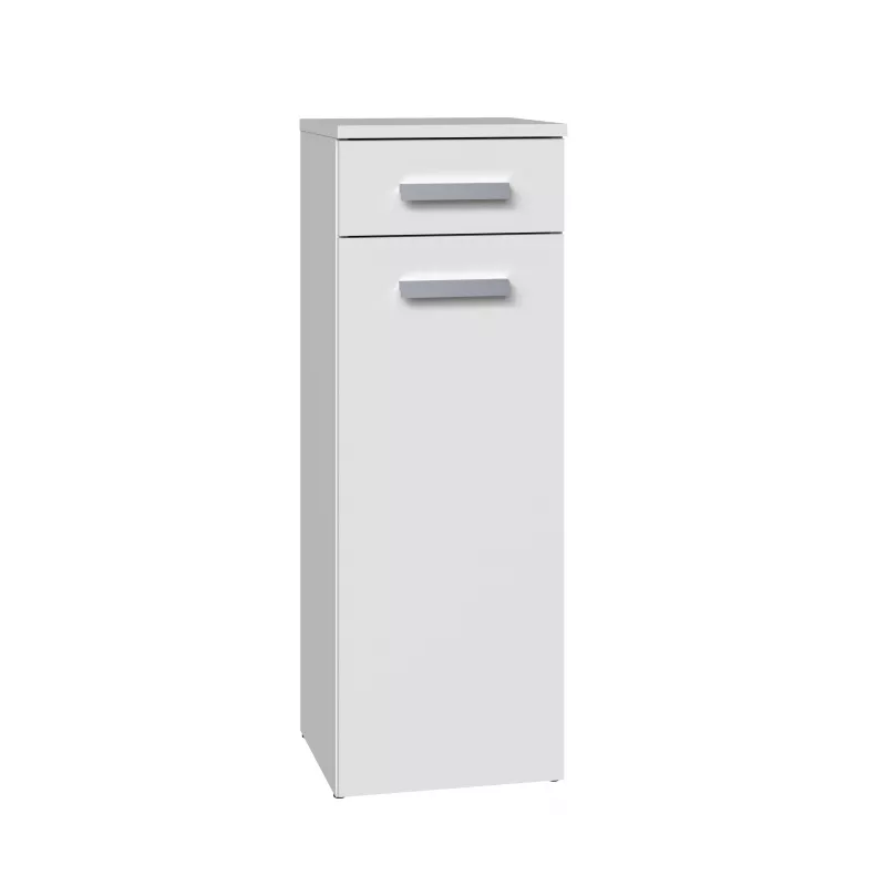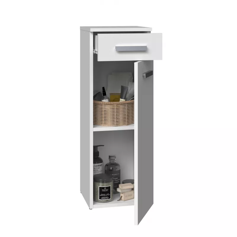 Nízká koupelnová skříňka ATSO je vybavena praktickou zásuvkou a skříňkou se 2 policemi. Díky svým rozměrům skříňka nezabere tolik místa, a proto je vhodná i do menších koupelen.