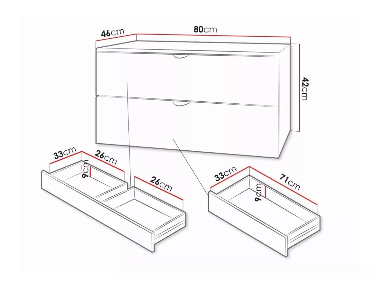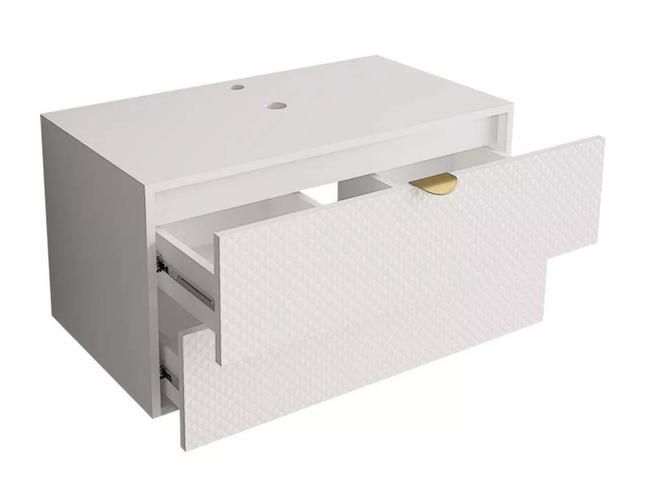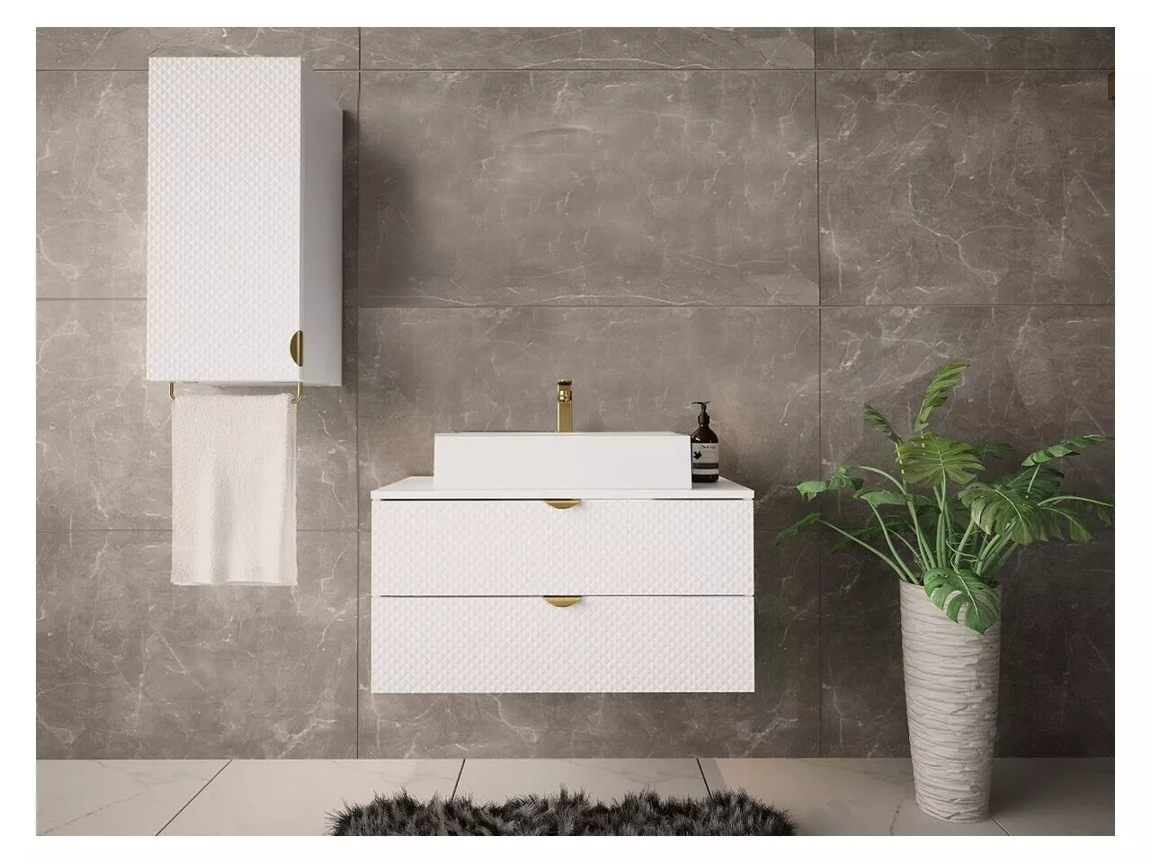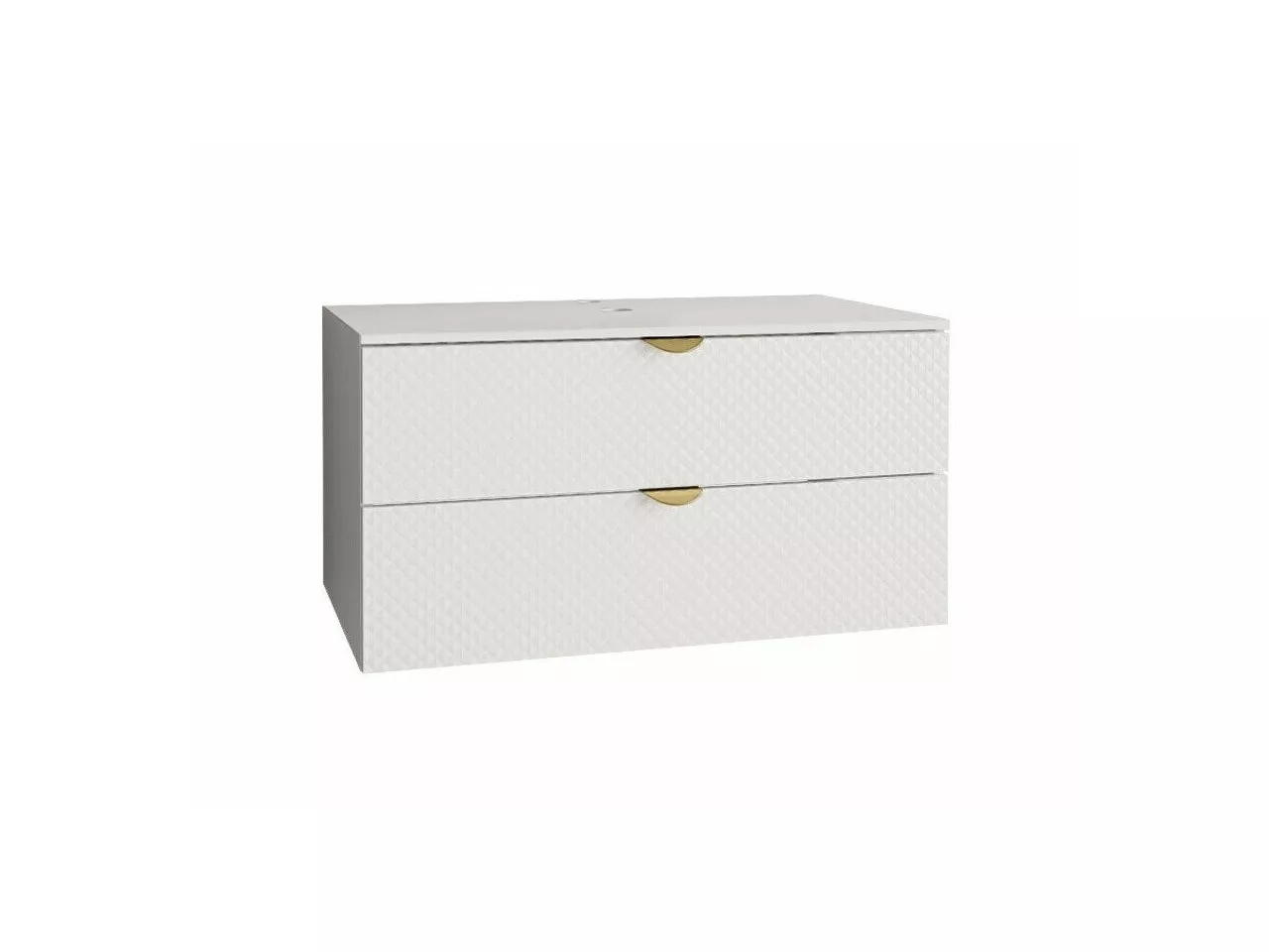 Skříňka PALBAN vyniká elegantním designem a praktickým uspořádáním se 2 prostornými šuplíky. Zlaté úchytky dodávají luxusní vzhled, zatímco závěsné provedení usnadňuje úklid.