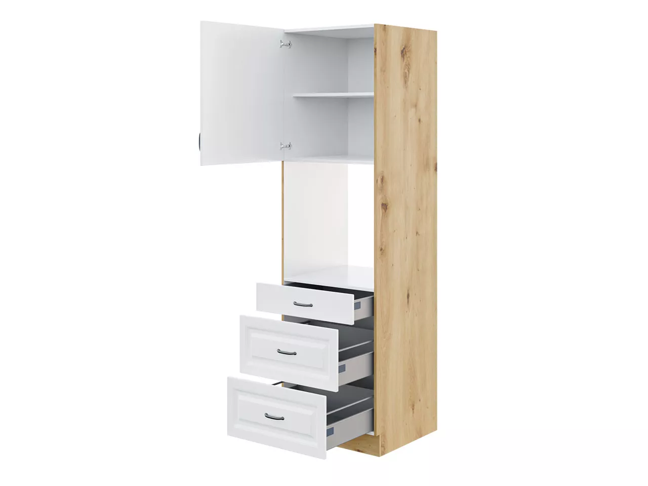 Praktická vysoká skříň pro vestavnou troubu FRYZIA šetří místo a zlepšuje přehlednost v kuchyni. Skříňka s dvířky a 3 různě vysoké šuplíky chrání uložené předměty před prachem a mastnotou. Nadčasový design a kvalitní provedení dělají z vysoké skříně perfektní volbu pro každou domácnost.
