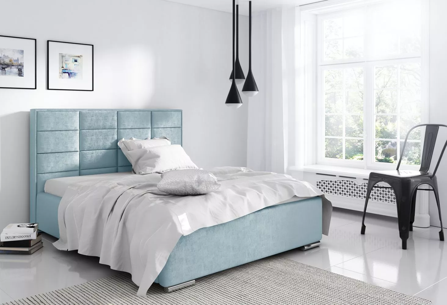 Manželská postel 180x200 CAFFARA nabízí exkluzivní design a širokou funkčnost. Bytelná konstrukce, jež se skrývá pod elegantním čalouněním, navazuje na vnitřní rošt s plynovým zvedacím mechanismem.