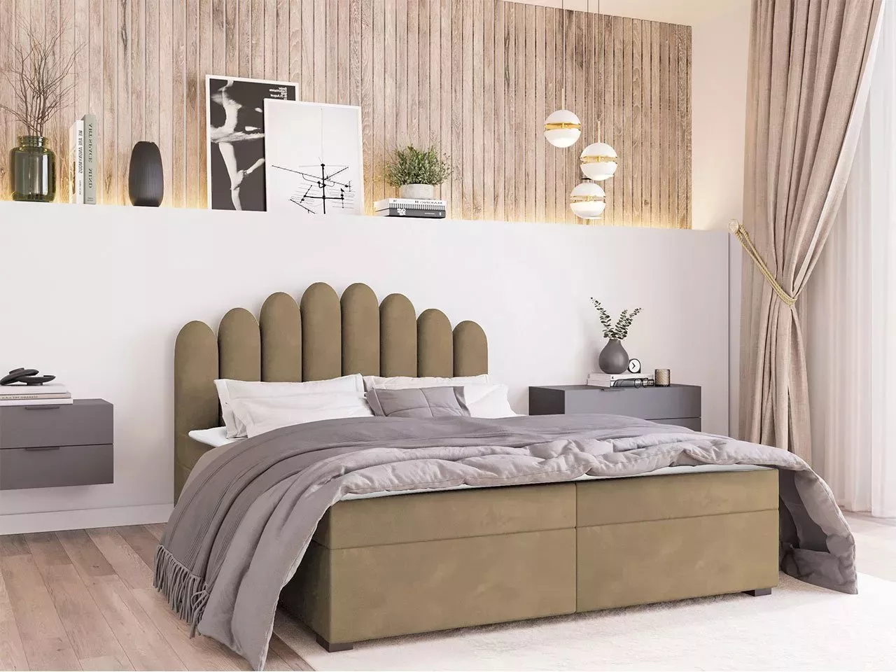 Boxspringová manželská postel 140x200 SALIMA se stylovým vzhledem skvěle zapadne do moderně laděné ložnice. Měkké čelo zaručí pohodlnou oporu zad při relaxaci s knížkou. Samozřejmostí je praktický úložný prostor na lůžkoviny.