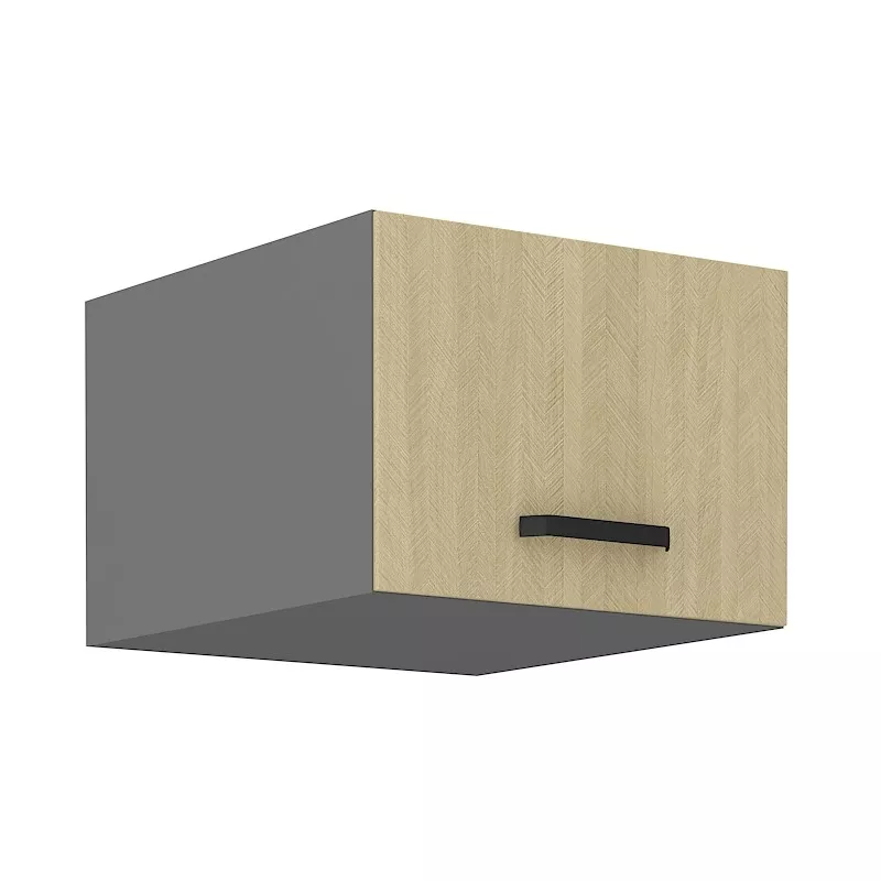 Horní hluboká skříňka s výklopnými dvířky MYRIAM se vyznačuje módními barvami a úchytem černé barvy. Dvířka se otevírají pomocí plynových pístů.