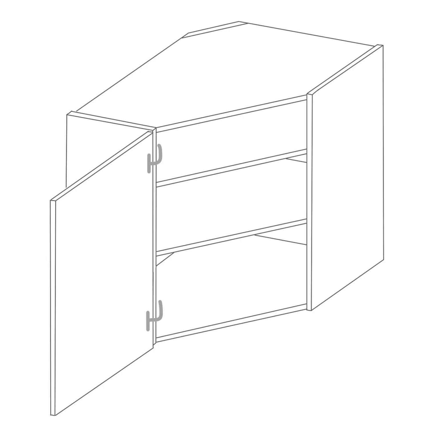 Horní skříňka vhodná pro umístění v rohu kuchyně má uvnitř dvě police. K výrobě nábytku pro korpus se používá deska v matu a pro dvířka ve vysokém lesku.
