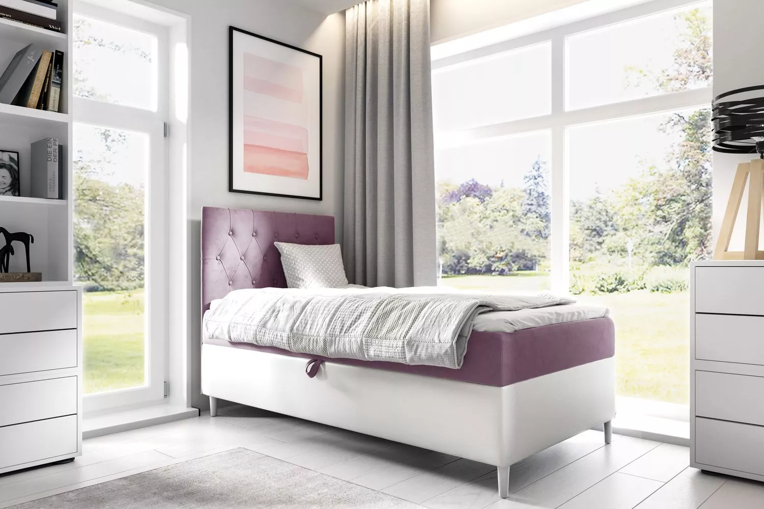 Kontinentální postel 100x200 KAILI 1 se hodí do všech studentských pokojů. Čalouněné čelo zamezí poškrábání a zašpinění zdi. Nechybí ani praktický úložný prostor otevíraný z pravé strany.