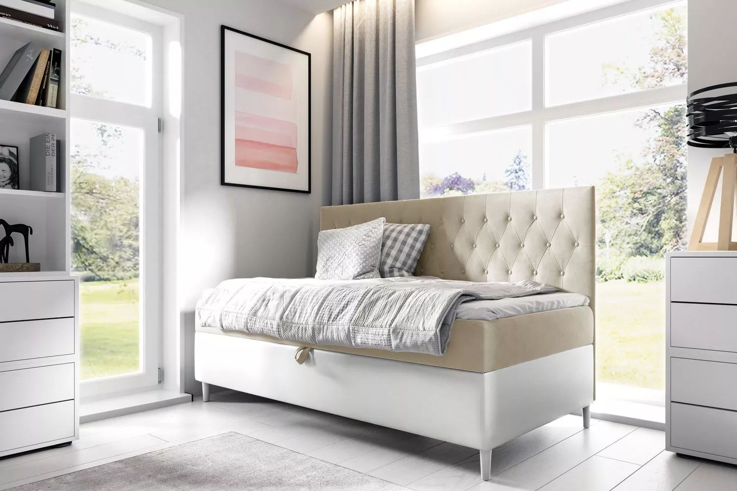 Kontinentální postel 100x200 KAILI 2 - béžová / bílá, otevírání z levé strany + topper ZDARMA