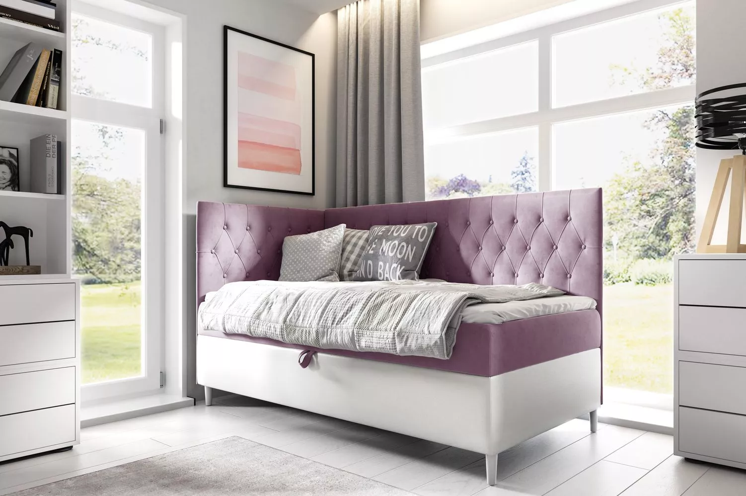 Kontinentální postel 90x200 KAILI 3 se hodí do všech studentských pokojů. Čalouněné čelo zamezí poškrábání a zašpinění zdi. Nechybí ani praktický úložný prostor otevíraný z levé strany postele.