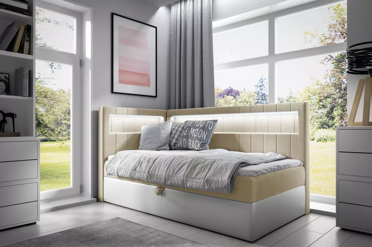 Jednolůžková postel 100x200 KISHA 3 se hodí do všech studentských pokojů. Součástí je studené led osvětlení ovládané pomocí ovladače. Nechybí ani praktický úložný prostor otevíraný z levé strany postele.