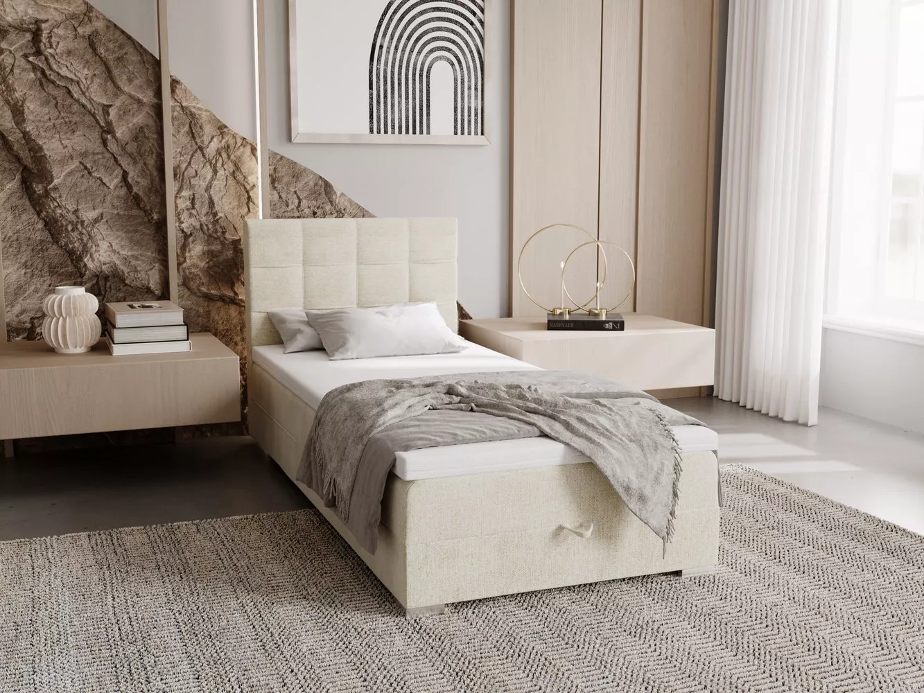 Součástí postele je zabudovaná matrace a úložný prostor. Postel dodáváme bez vyobrazeného topperu. Vhodné modely k dokoupení najdete v sekci Doporučujeme přikoupit.
