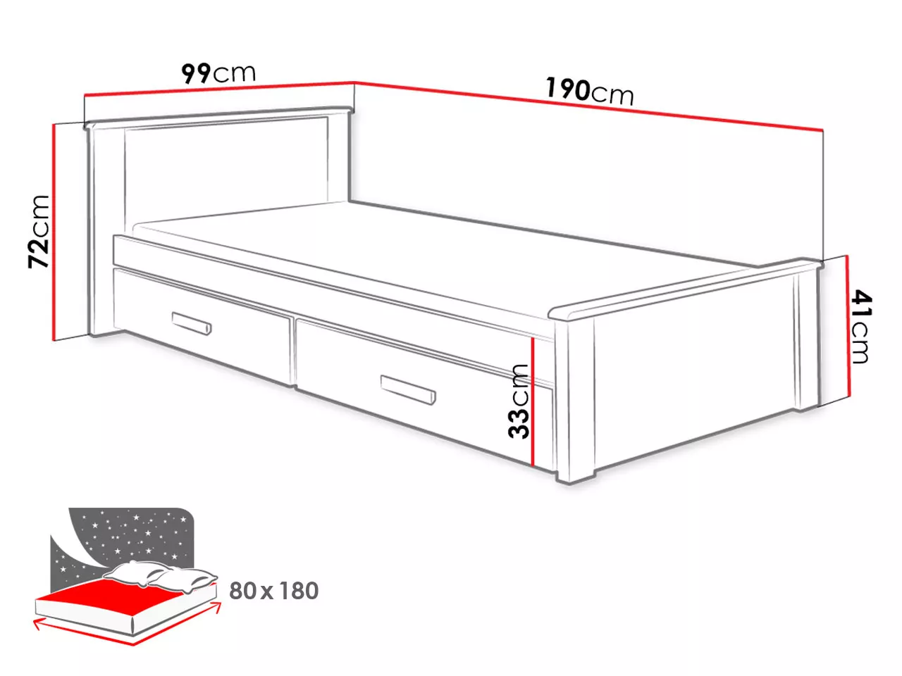 Dětská postel POLCH o spací ploše 80x180 je vyrobena z kvalitního borovicové masivu a LTD desky, které zaručují odolnost a stabilitu postele. Nechybí ani praktický úložný prostor v podobě 2 zásuvek. Vysoké čelo postele zajišťuje opěrku pro polštář a také chrání stěnu před znečištěním.