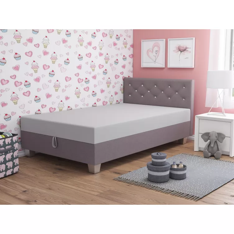 Jednolůžková postel FREDERIKA 2 má jednoduchý, ale elegantní design. Čelo zdobené krystalky chrání stěnu před znečištěním. Postel má úložný prostor pro úschovu ložního prádla.