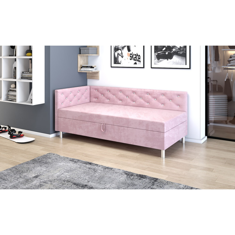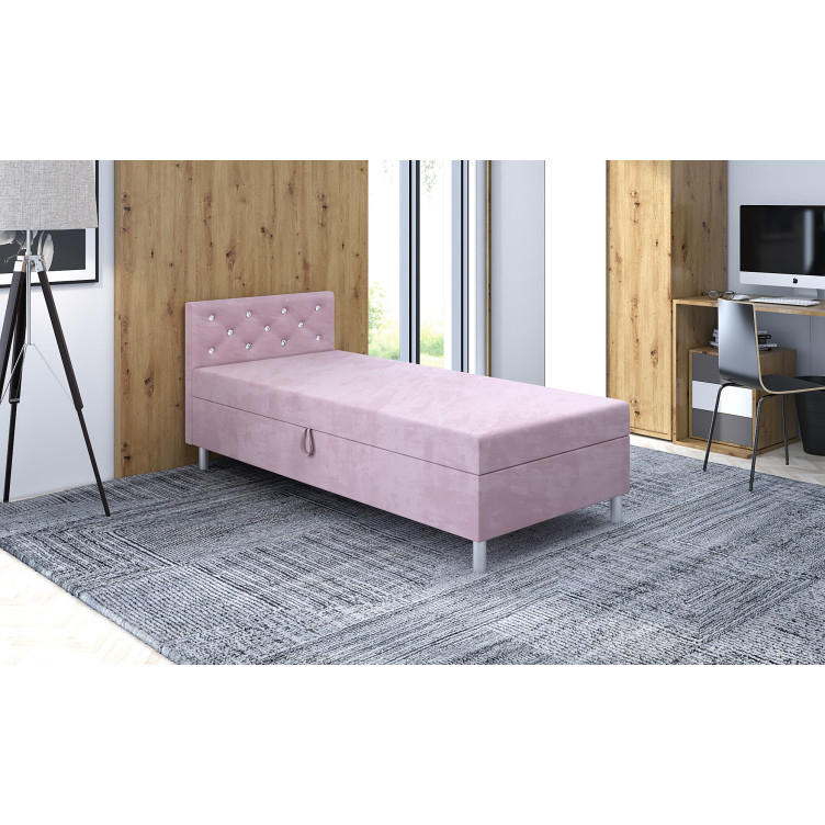Jednolůžková postel FREDERIKA 1 má jednoduchý, ale elegantní design. Čelo zdobené krystalky chrání stěnu před znečištěním. Postel má úložný prostor pro úschovu ložního prádla.