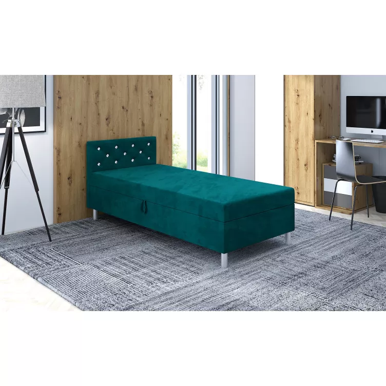 Jednolůžková postel PIXI 2 má jednoduchý, ale elegantní design. Čelo zdobené krystalky chrání stěnu před znečištěním. Postel má úložný prostor.