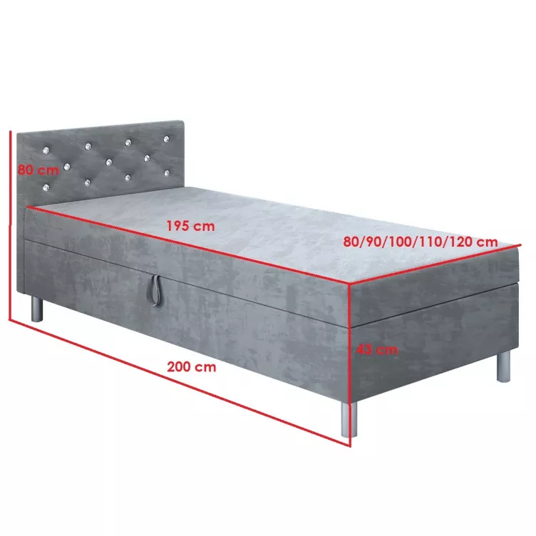 Jednolůžková postel PIXI 2 má jednoduchý, ale elegantní design. Čelo zdobené krystalky chrání stěnu před znečištěním. Postel má úložný prostor.
