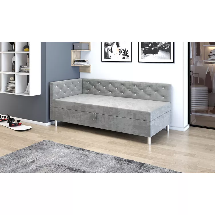 Jednolůžková postel PIXI PLUS 1 má jednoduchý, ale elegantní design. Čelo zdobené krystalky chrání stěnu před znečištěním. Úložný prostor umožní perfektně uschovat ložní prádlo.