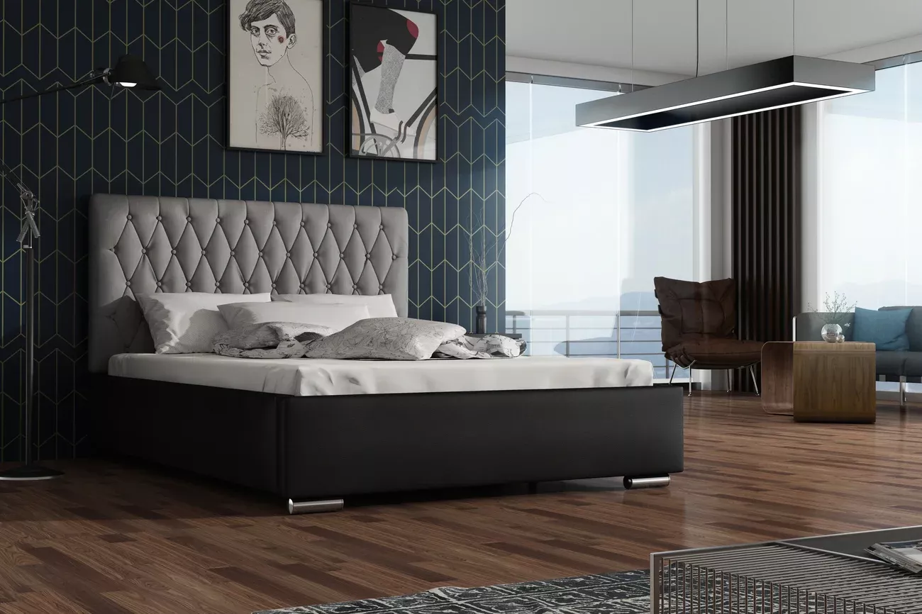 Jednolůžková postel 90x200 SIRENA 1 s prošívaným čelem a zdobeným knoflíky se stane dominantou každého prostoru. Boky postele jsou potaženy černou eko kůží. Kovové stříbrné nožičky dodávají posteli atraktivní design.